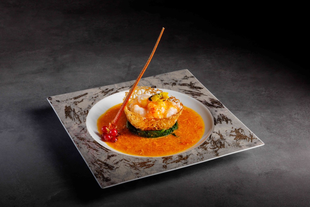 金盞蟹粉龍蝦球,炸脆的金盞內有肉質彈牙富嚼勁的龍蝦球,伴蟹粉吃,有雙重鮮美口感。