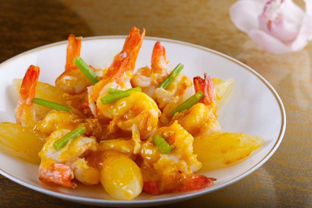 白玉蟹粉燴鮮蝦,爽口的鮮蝦與軟腍的白玉蘿卜伴蟹粉燴煮,兩者吸收了蟹粉的味道,齒頰留香。