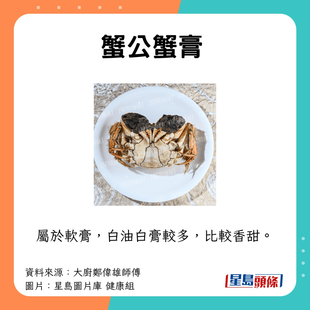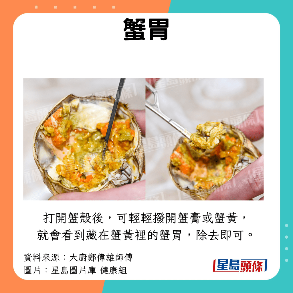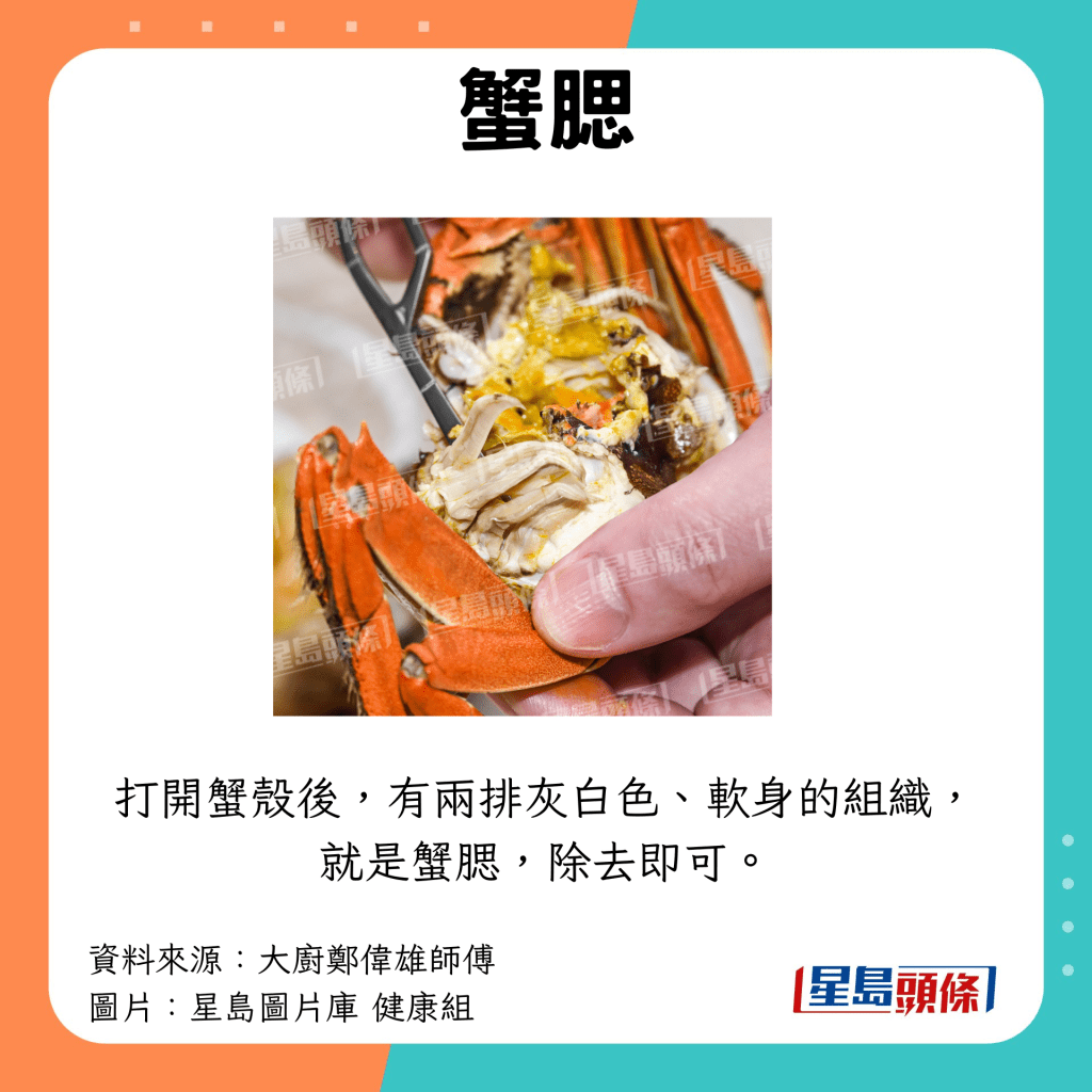 2. 蟹心:比較寒涼,進食后會寒上加寒,容易引致腸胃不適,不宜食用。