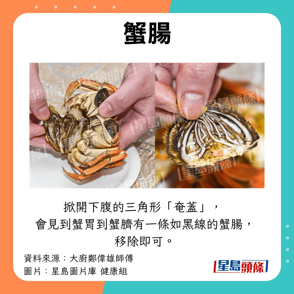 1. 蟹腸:蟹的消化系統,藏有排泄物,十分臟。