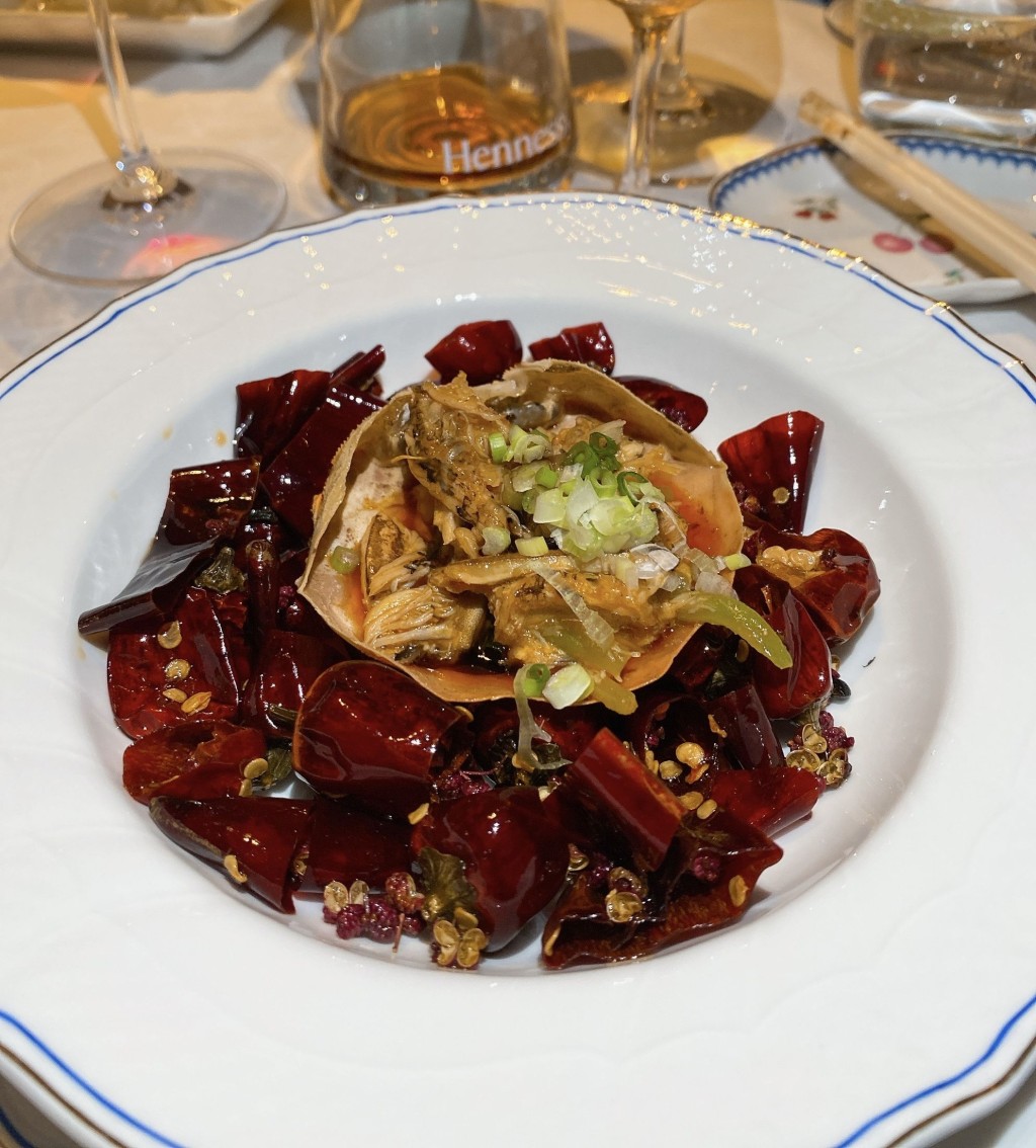 接下來的大閘蟹四味各具地方色彩,成都君悅的香辣炒蟹斗,以手拆江蘇大閘蟹炒豬腩肉粒和辣椒干,鮮香麻辣而味道濃厚,貫徹川蜀風味。至于香港君悅的時令蟹粉扒豆苗,味道清淡而口感豐富。眼前泛黃光的蟹粉蛤蜊手工面由上海柏悅操刀,不但濃郁甘甜,且香氣十足,洋溢滬菜風格。
