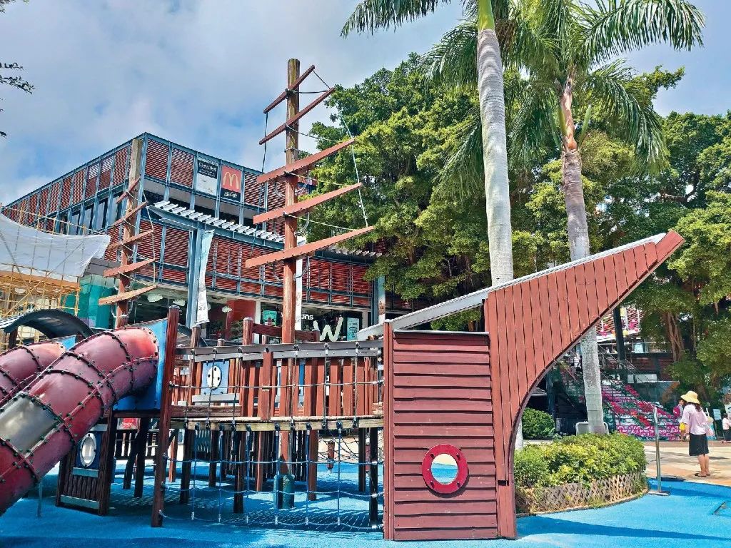 沿著平臺電梯一路降至地面露天廣場,看見其他小朋友興高采烈地圍著某設施跑跑跳跳,原來是一座面向海灣的海盜船造型游樂設施。