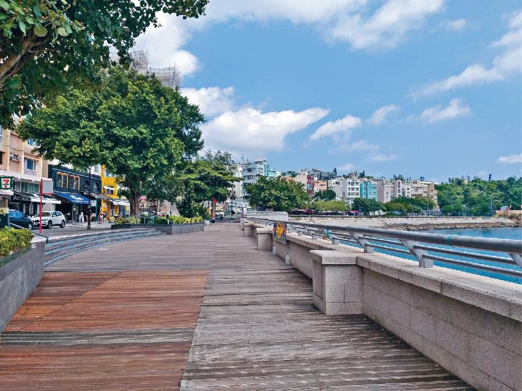 海濱長廊旁有一列整齊大樹,阻隔馬路灰塵外,也劃出讓行人自在行走的步道。步道由木條鋪成,營造出與周遭低矮樓房相襯的閑適感。走在其中,猶如置身異國小鎮,舒適安靜。