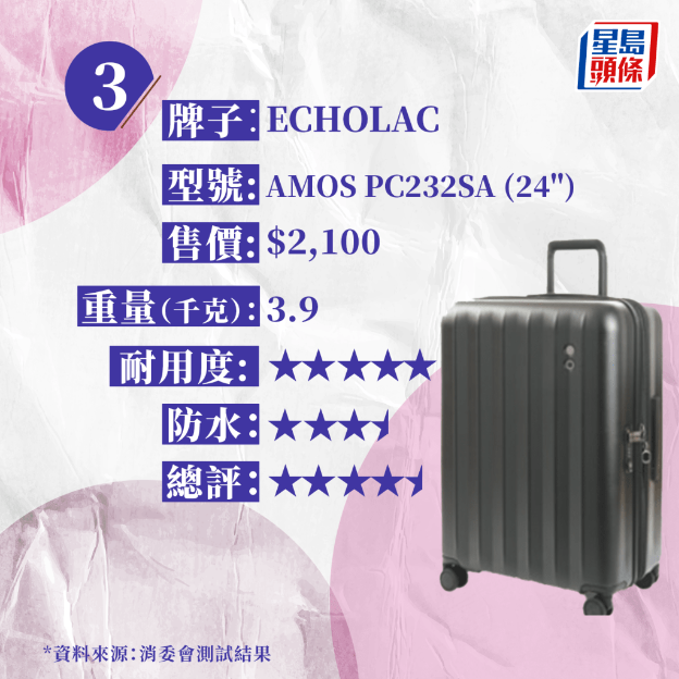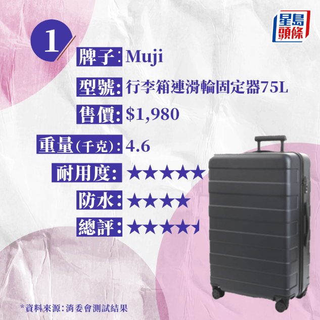 整體評分最高(4.5分)的4款樣本中,有2款售價為2,500元以下,分別為“Muji 行李箱連滑輪固定器75L”(約1980元)及“ECHOLAC AMOS PC232SA(24″)”(約2100元)。而售價最高的1款“RIMOWA ESSENTIAL CHECK-IN M”( 約8,200元),整體評分僅獲3.5分,特別在路面行走性能與拉桿強度方面,在行走路程未及 60公里時,拉桿手柄便斷裂,表現強差人意。