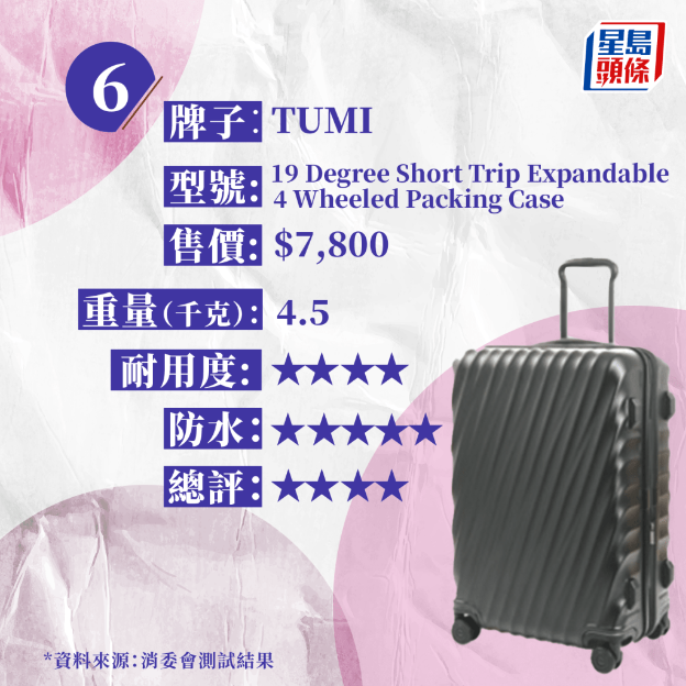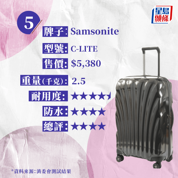 圣誕新年旅游旺季即將來臨,不少人會買行李箱準備外游。消委會測試15款中型硬身拉鏈式行李箱的耐用和化學安全程度,其中7款樣本經長距離拖行后,分別出現車輪脫落、箱身破裂、拉桿或拉桿手柄折斷、松脫等情況。售價最高的“RIMOWA ESSENTIAL CHECK-IN M”(約8,200元(港幣,下同)),整體評分僅獲 3.5 分,在行走路程未及 60公里時,拉桿手柄便斷裂。其中一款樣本的手挽有部分物料檢出的塑化劑含量超出歐盟REACH法規訂立的上限45倍,或會影響生殖健康。