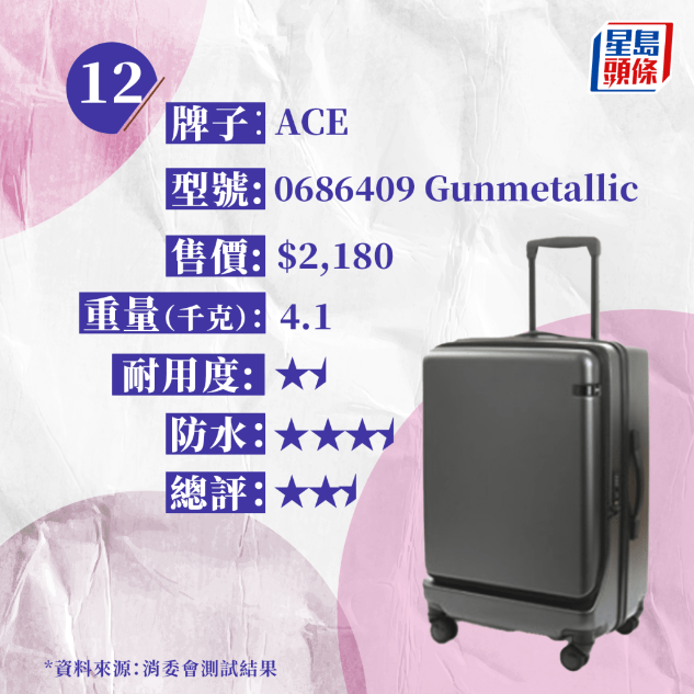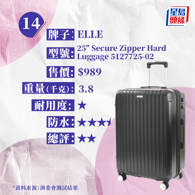 是次測試的15款樣本均為中型硬身行李箱,高度約24吋至28吋,屬于寄艙行李類別,全部配備可供海關人員以保安鑰匙打開檢查的TSA密碼鎖,外殼均由膠料制造,重量約由2.5千克至6.2千克,售價由730元至8,200元,相差逾10倍。