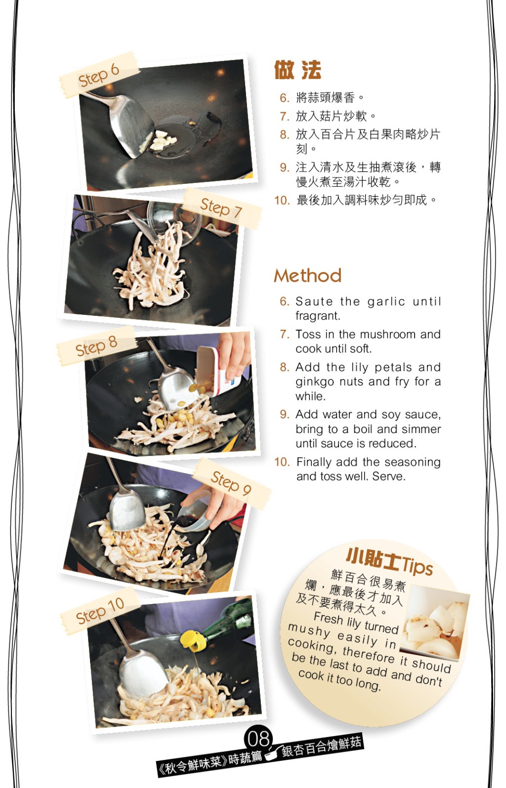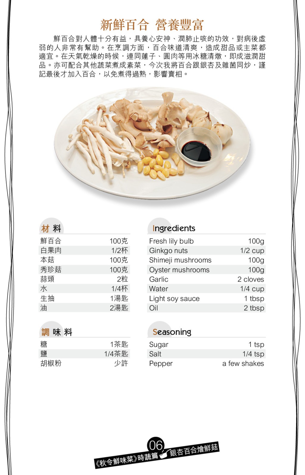 喜歡吃菇菌,這道素小炒銀杏百合燴鮮菇,必合胃口。先起油鑊爆香蒜頭,加鮮百合瓣、白果肉 、本菇、秀珍菇炒勻,下白果肉、清水、生抽煮至收汁,最后加糖、鹽及胡椒粉調味。烹調此家常菜,可按個人口味,加入適合炒煮的菇菌。另可購買現成白果肉入饌,若采用連殼白果取肉,謹記去掉帶苦味的果芯。