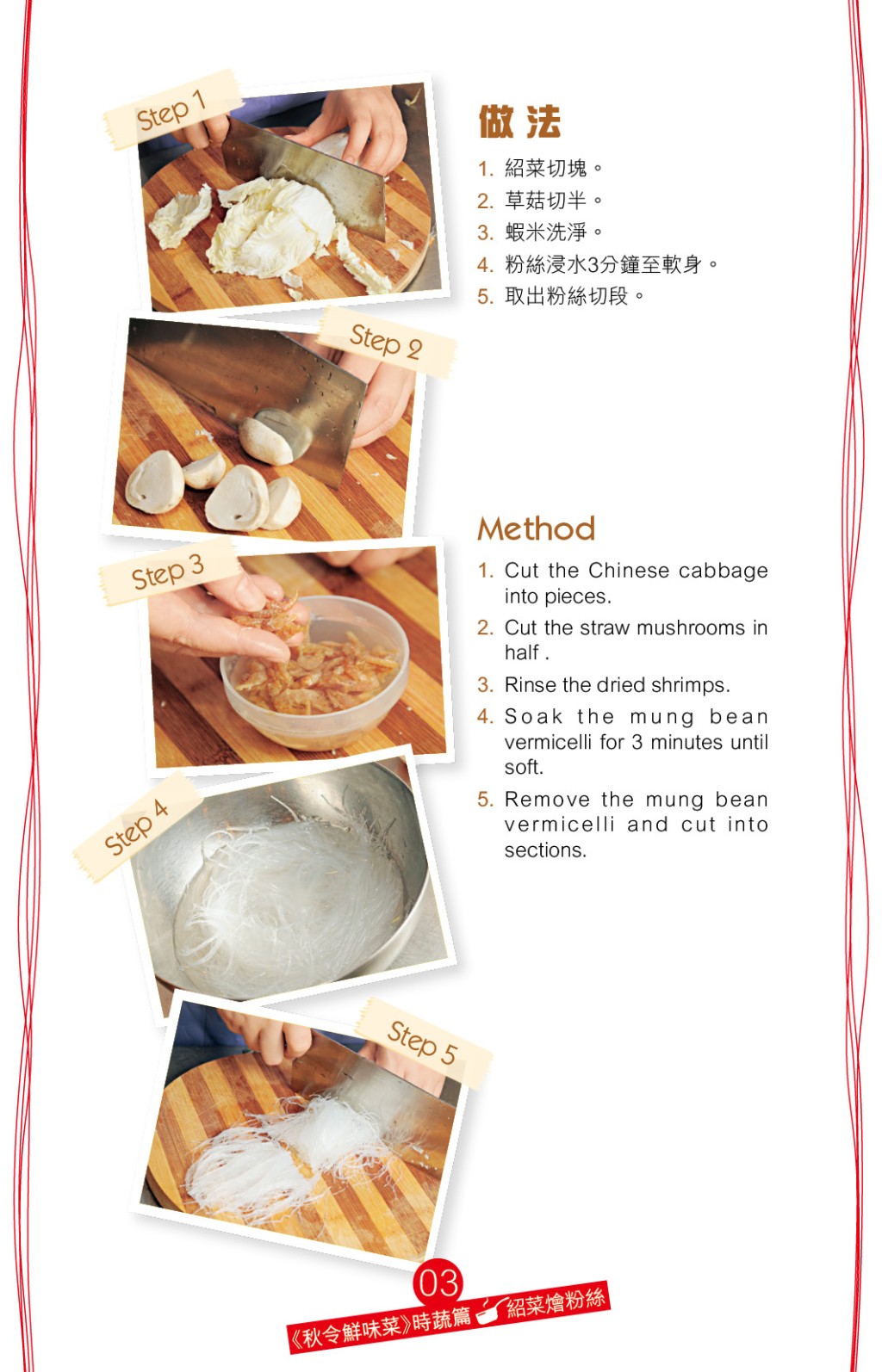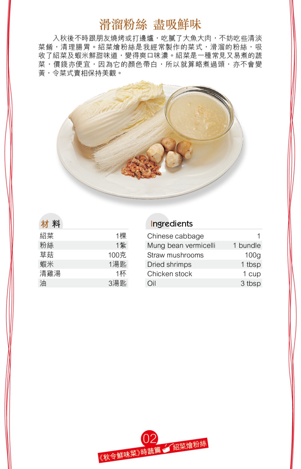 紹菜正值當造,味道特別清甜。想吃到紹菜的清新甜味,不妨煮一道紹菜燴粉絲。材料包括紹菜、草菇、蝦米、粉絲及清雞湯。先洗凈材料,起油鑊爆香蝦料及菜菇,加入切件的紹菜及浸軟的粉絲炒勻,注入清雞湯,以中大火煮熟紹菜,加少許調味便可上桌。吃全素的話,可以蔬菜湯代替雞湯,也可以增加湯的分量,做成湯菜。
