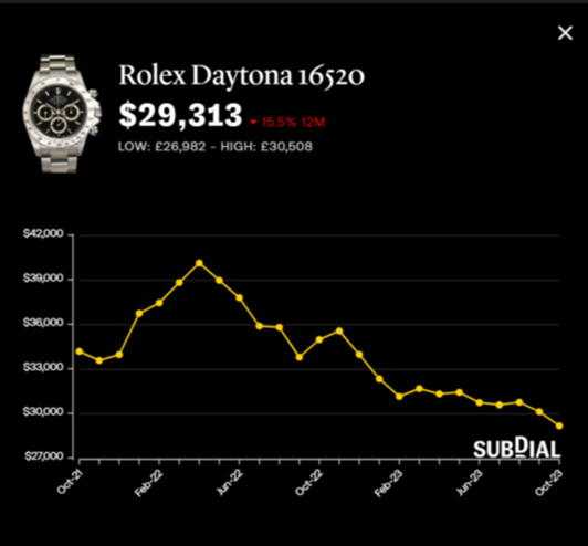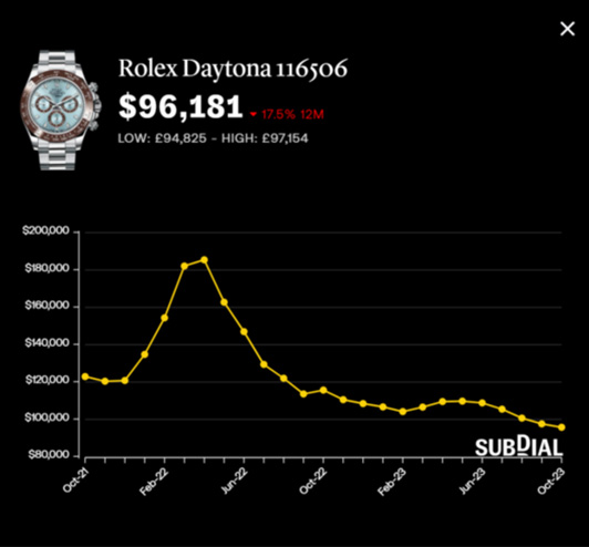 Subdial共同創辦人Christy Davis表示,二手市場上的手表數量自8月以來已增加5%。隨著供應量增加以及出售庫存的時間更長,二手手表經銷商降低估值以刺激銷售,或導致奢華手表價格進一步走弱。