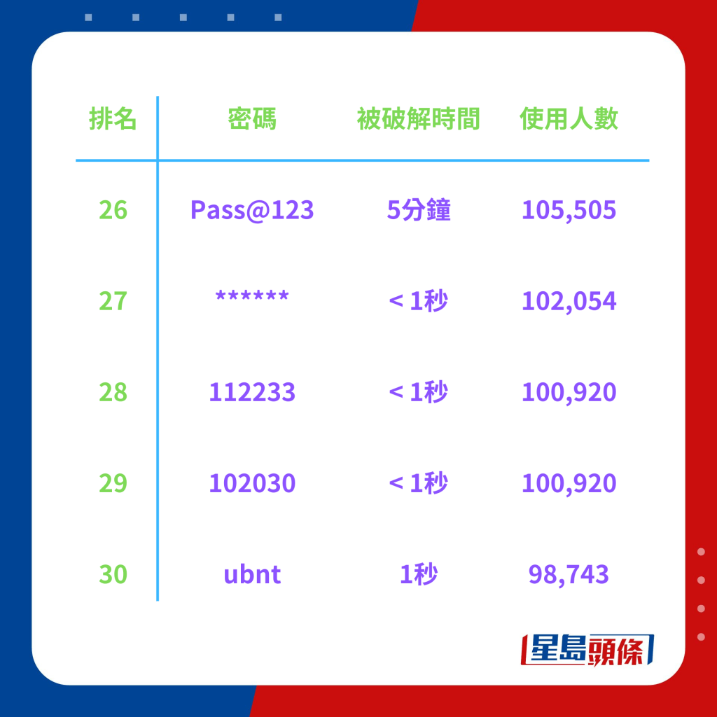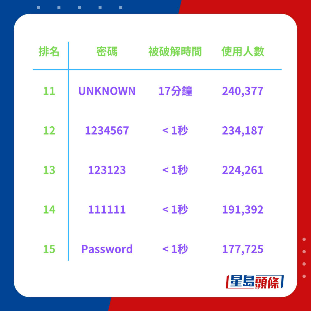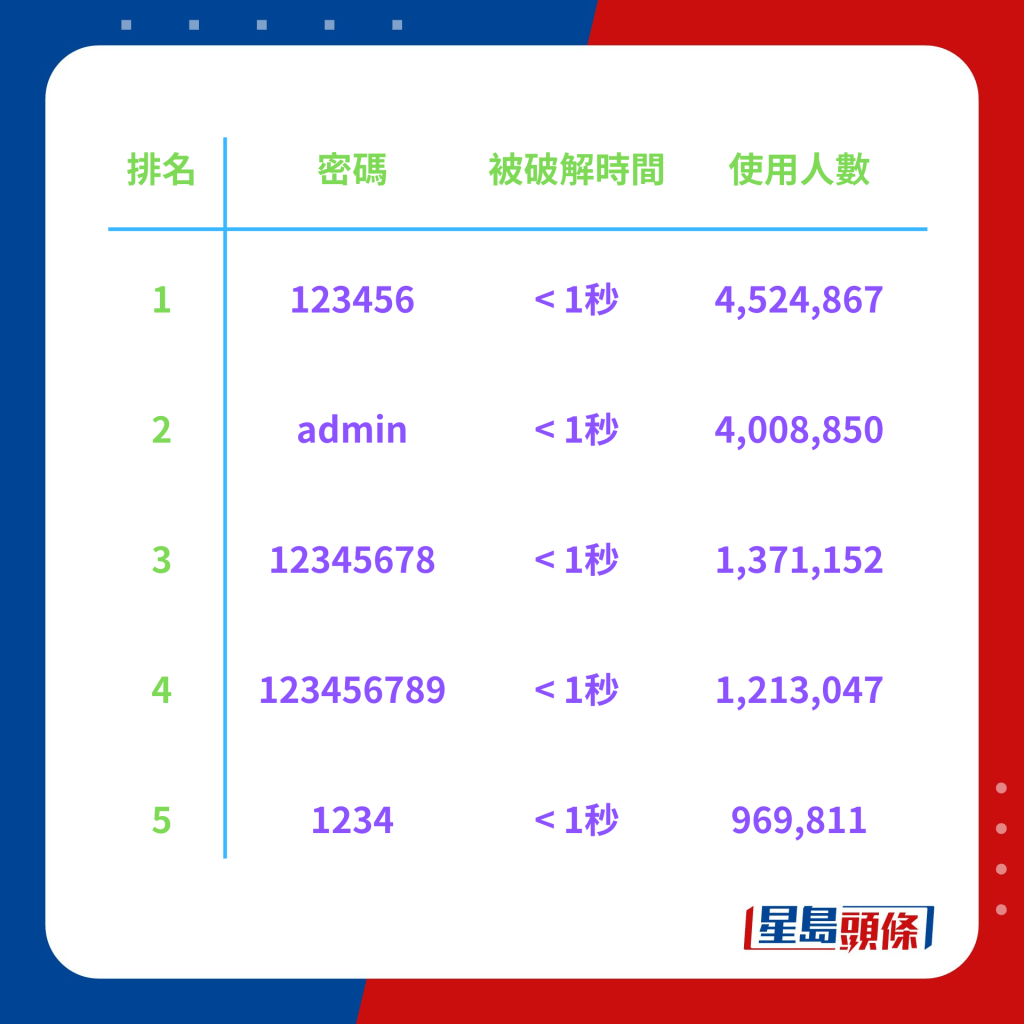 近年網絡騙案猖狂,除了需要時刻保持警覺外,更應該加強保護個人賬戶的安全,例如設置較高強度的密碼,避免黑客有機可乘。 由Nord VPN推出的密碼管理工具Nord Pass于日前發布了”全球200大常用密碼排行榜”,當中有超過7成的密碼被黑客秒速破解,最常見的密碼更多達450萬人使用,可見帳戶安全問題存在過多的隱憂。