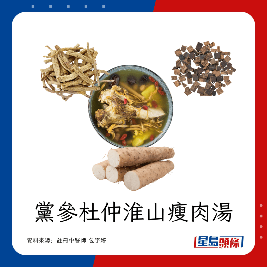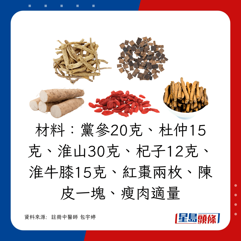 材料:黨參20克、杜仲15克、淮山30克、杞子12克、淮牛膝15克、紅棗兩枚、陳皮一塊、瘦肉適量