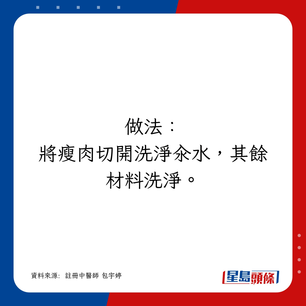 瘦肉切開洗凈汆水,其余材料洗凈。