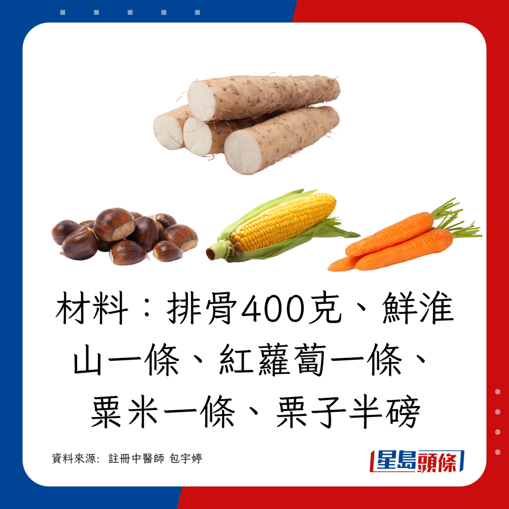 排骨400克、鮮淮山一條、紅蘿卜一條、粟米一條、栗子半磅