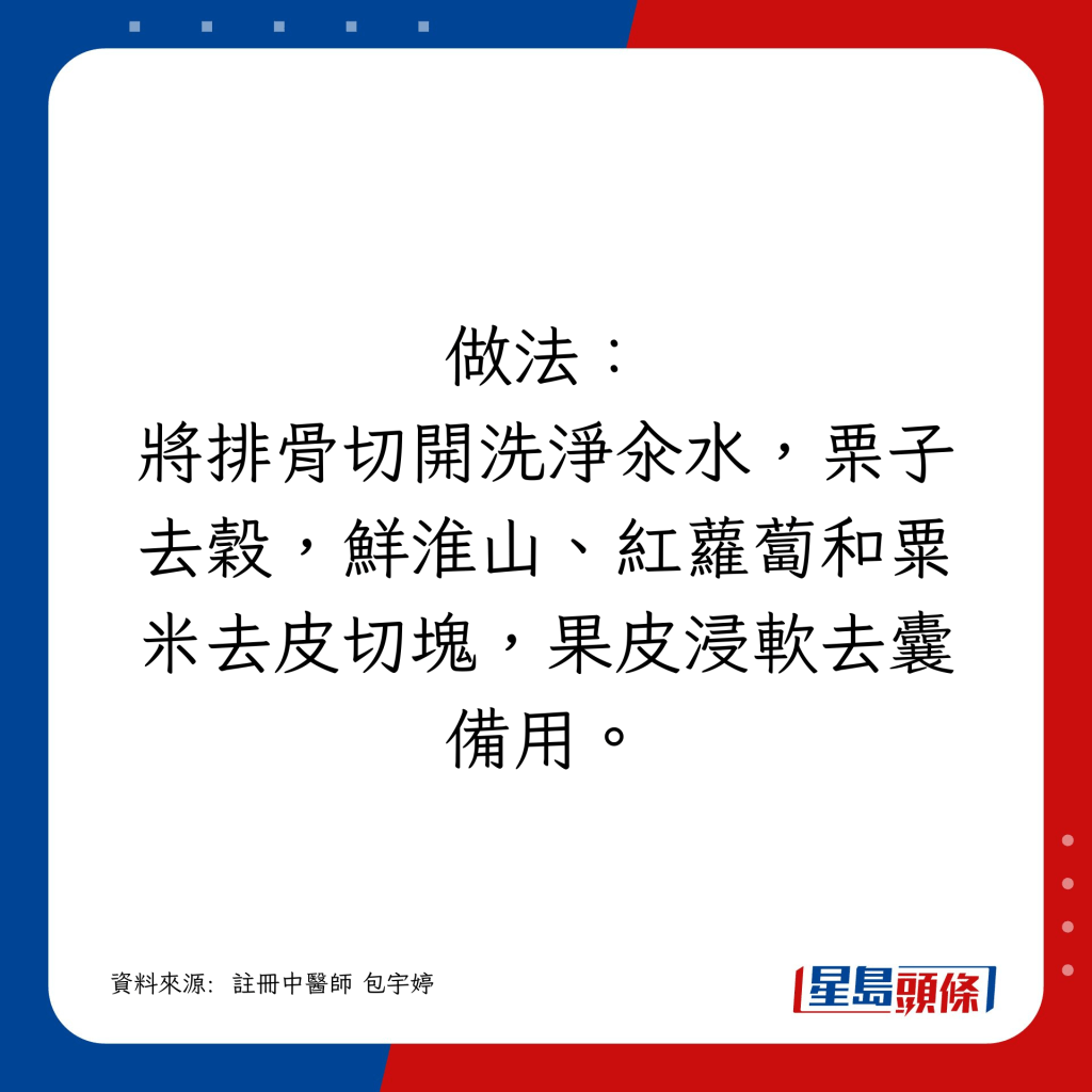 將排骨切開洗凈汆水,栗子去谷,鮮淮山、紅蘿卜和粟米去皮切塊,果皮浸軟去囊備用。