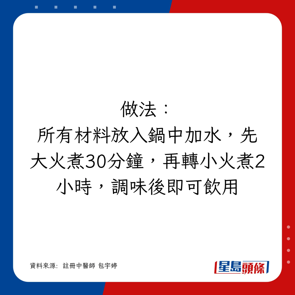 所有材料放入鍋中加水,先大火煮30分鐘,再轉小火煮2小時,調味后即可飲用