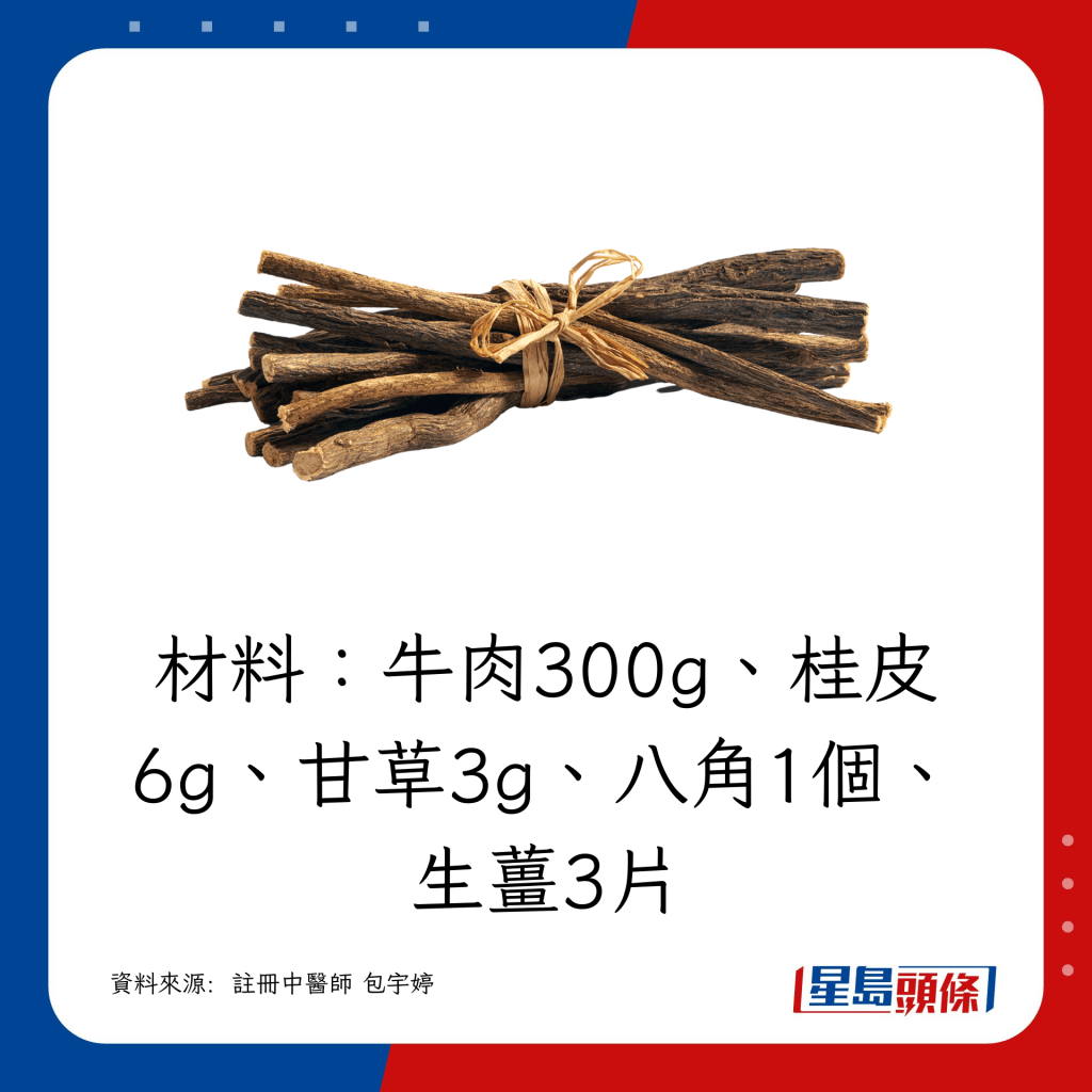牛肉300g、桂皮6g、甘草3g、八角1個、生姜3片