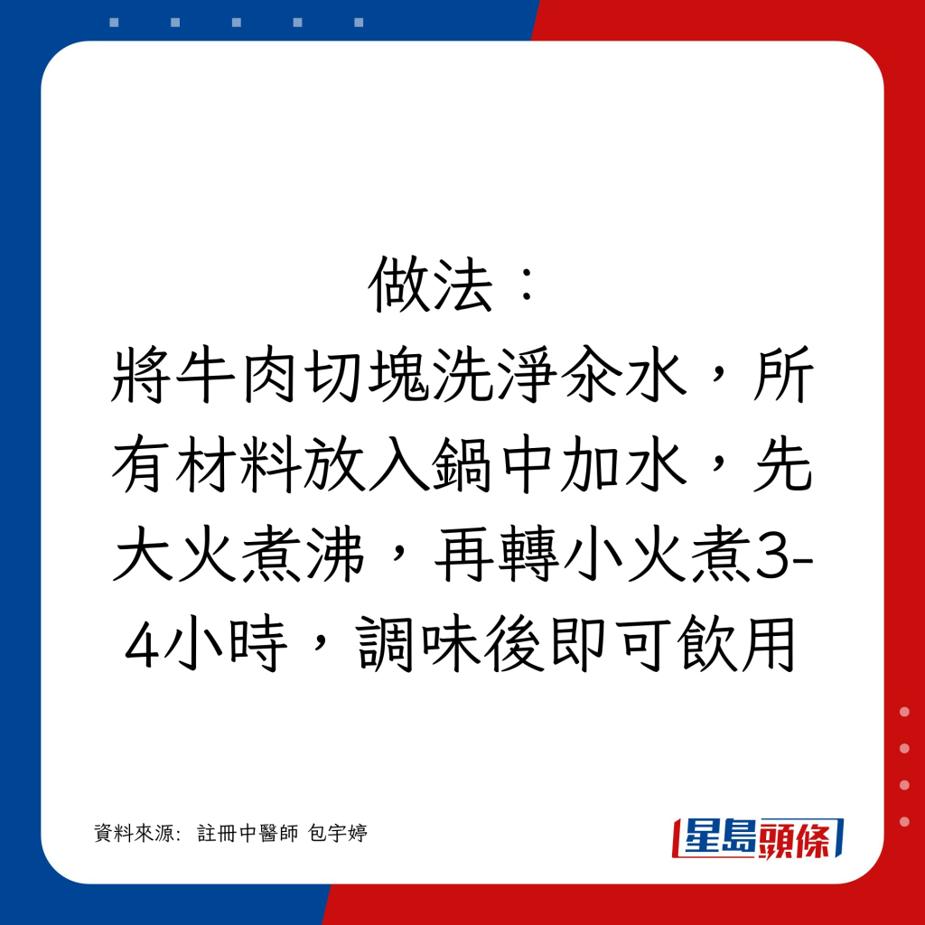 將牛肉切塊洗凈汆水,所有材料放入鍋中加水,先大火煮沸,再轉小火煮3-4小時,調味后即可飲用