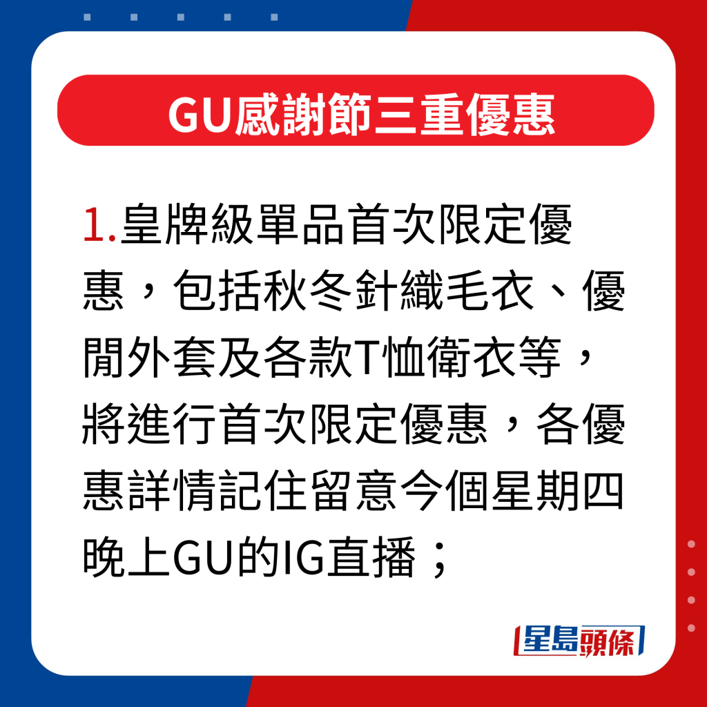 GU感謝節三重優惠,1.皇牌級單品首次限定優惠,包括秋冬針織毛衣、優閑外套及各款T恤衛衣等,將進行首次限定優惠,各優惠詳情記住留意今個星期四晚上GU的IG直播;