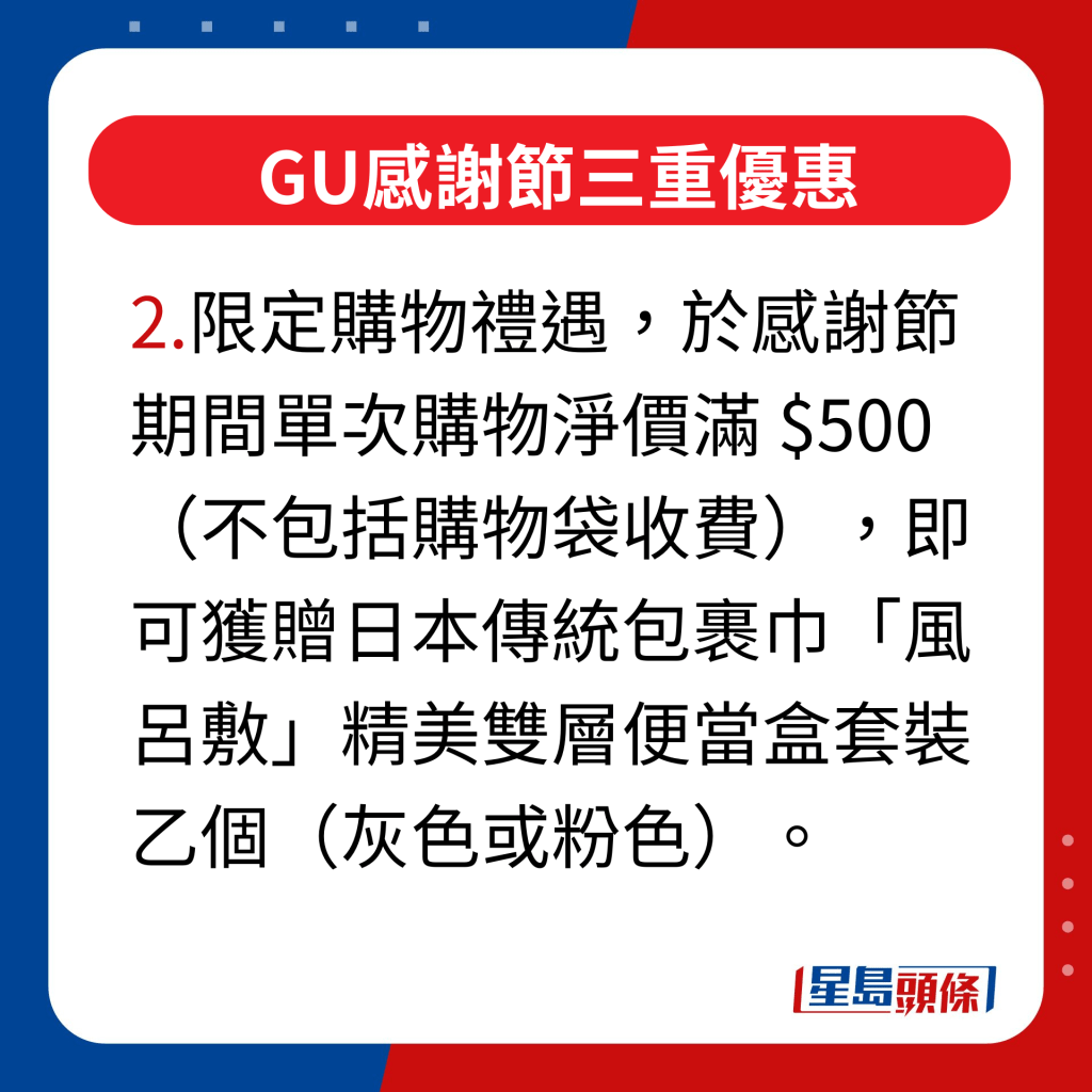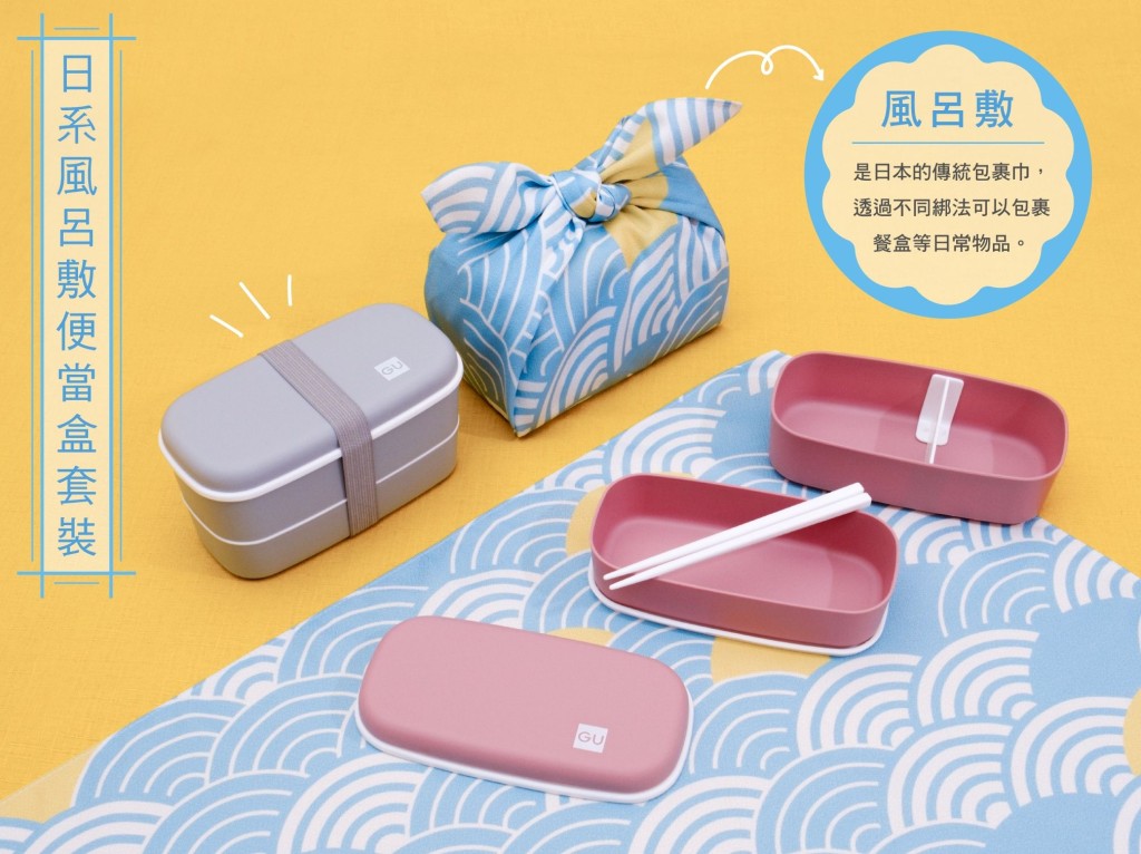 GU感謝節三重優惠,2.限定購物禮遇,凡于感謝節活動期間單次購物凈價滿 $500(不包括購物袋收費),即可獲贈日本傳統包裹巾“風呂敷”精美雙層便當盒套裝乙個(灰色或粉色),最適合作為秋游野餐或上班族帶飯的之選。