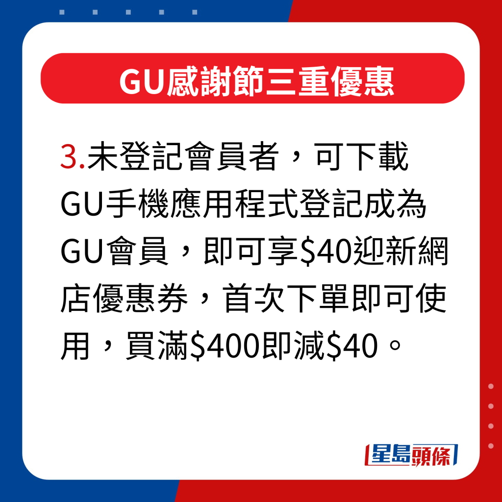 3. 新登記會員:未登記會員者可下載GU手機應用程序登記成為GU會員,即可享HK$40迎新網店優惠券,首次下單即可使用,買滿HK$400即減HK$40。