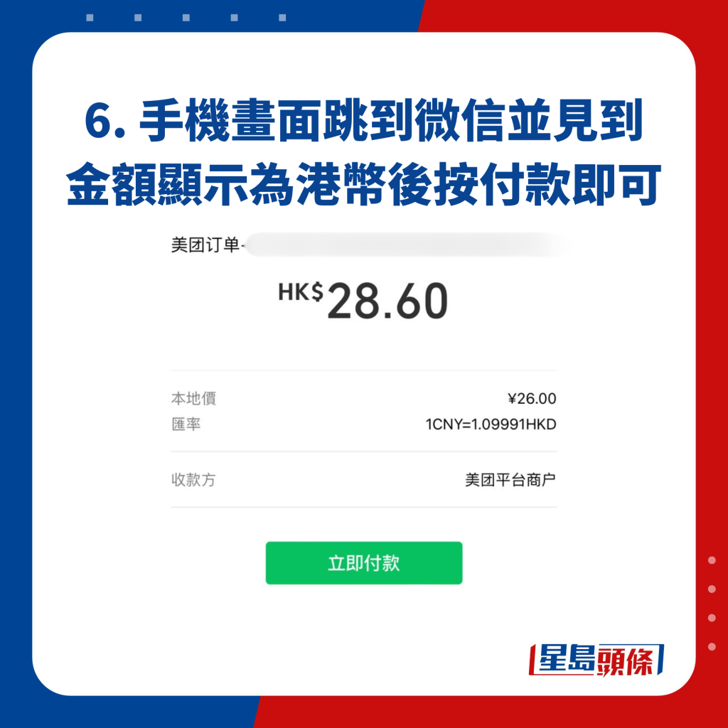 手機畫面跳到微信并見到金額顯示為港幣后按付款即可
