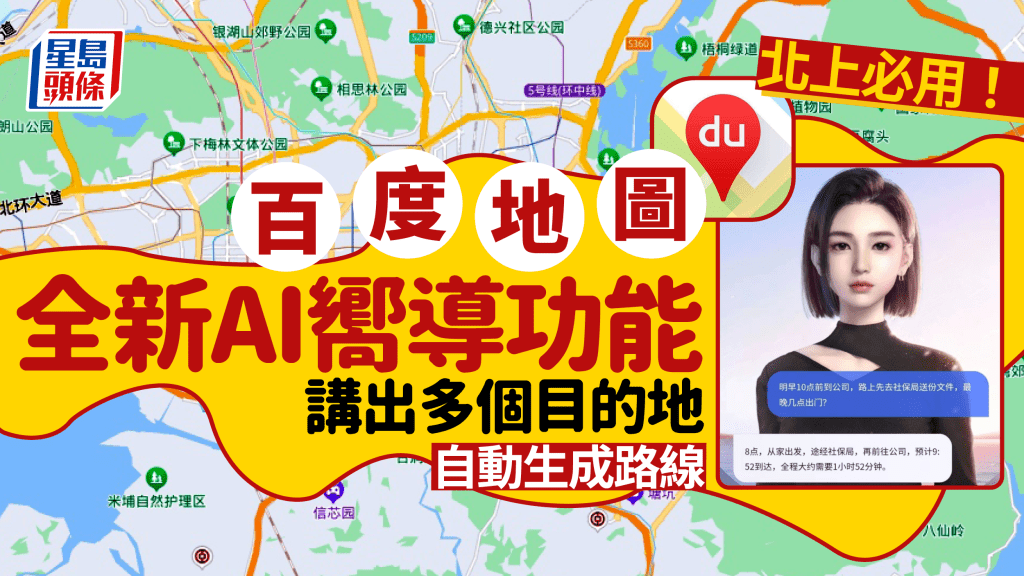 市面上有好多不同地圖導航的手機應用程序,其中,百度地圖近日就推出全新AI向導功能,靠著AI的幫助,用戶只需要輸入目的地就立即生成路線,非常方便! 大家日后有機會北上時,就可以下載試用最新功能了!