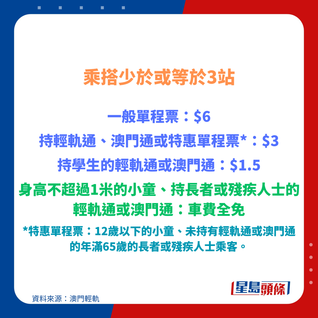將于12月8日通車的全新跨海段更將列車服務延伸至媽閣站,只須5分鐘的時間就可經跨海隧道直達澳門半島,相當快捷。此外,車站出口更連接了媽閣廟、澳門海事博物館等地標,旅客可以盡情暢游澳門。而輕軌的票價按乘搭站數計算,一般由$6-$12不等。