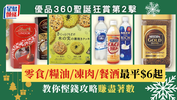 踏入12月,很快又到圣誕、新年,聚會、送禮少不免,優品360的圣誕狂賞第2擊,精選零食、飲品、糧油、凍肉、餐酒6折起,Party小食、抽獎禮盒、交換禮物,總有你的心水美食,參考本文的省錢攻略,就更能用盡優惠、省上加省。溫馨提示,優品360今期積分在12月31日到期,逾期積分作廢。