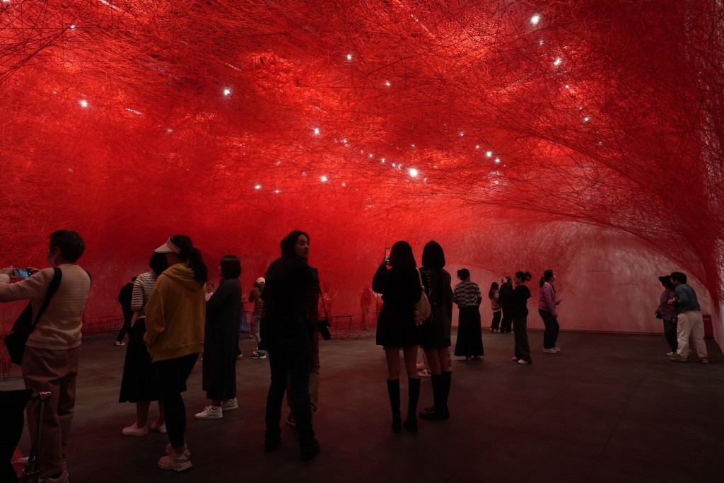 這次《鹽田千春——顫動的靈魂》巡演,自東京首站,第六站來到全新的深圳美術館。甫入展廳,就是其標志性的紅色交織世界“不確定旅程”。由地上的小船,延伸至天花板,交錯纏繞的紅線在燈光映照下,除了反映創作者的精神世界,亦以紅線凸出人與人之間不同的關系狀態。滿目的紅色,張力十足。