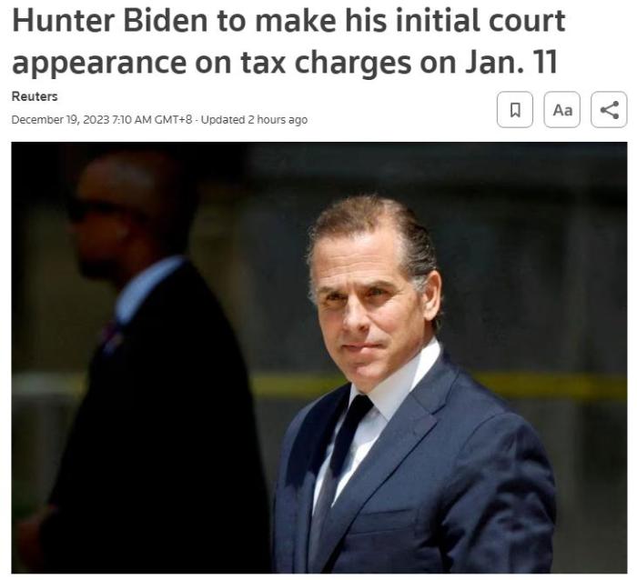 據路透社18日報道,法庭文件顯示,美國總統喬·拜登的兒子亨特·拜登將于2024年1月11日就稅務指控,在洛杉磯首次出庭。