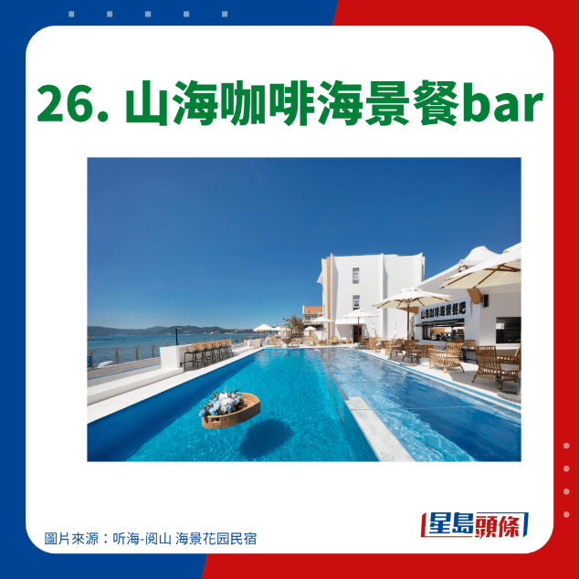 有“深圳最美海灘”之稱的大鵬較場尾,出名水清沙幼,近年有不少特色民宿及Cafe開業。當中最有話題性的,就是新開的“山??Х群>安虰ar”。店內最大的特色,就是有一個縷空的特大泳池。泳池底部設藍色的泳池房間,頂層鋪有一層薄薄的水。當陽光透射進來,整個房間波光粼粼,就似置身水底用餐般夢幻!至于Cafe其他位置則擺放了木椅及太陽傘,望向無遮擋的海景,就似在海島度假一樣寫意。餐廳有提供咖啡薯條等輕食,主食則以泰菜為主。