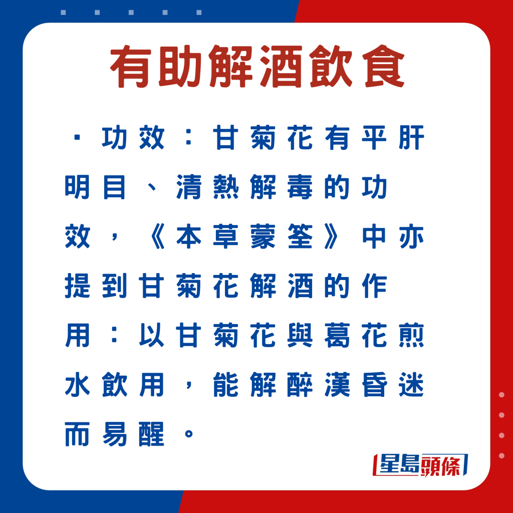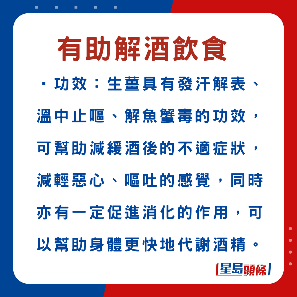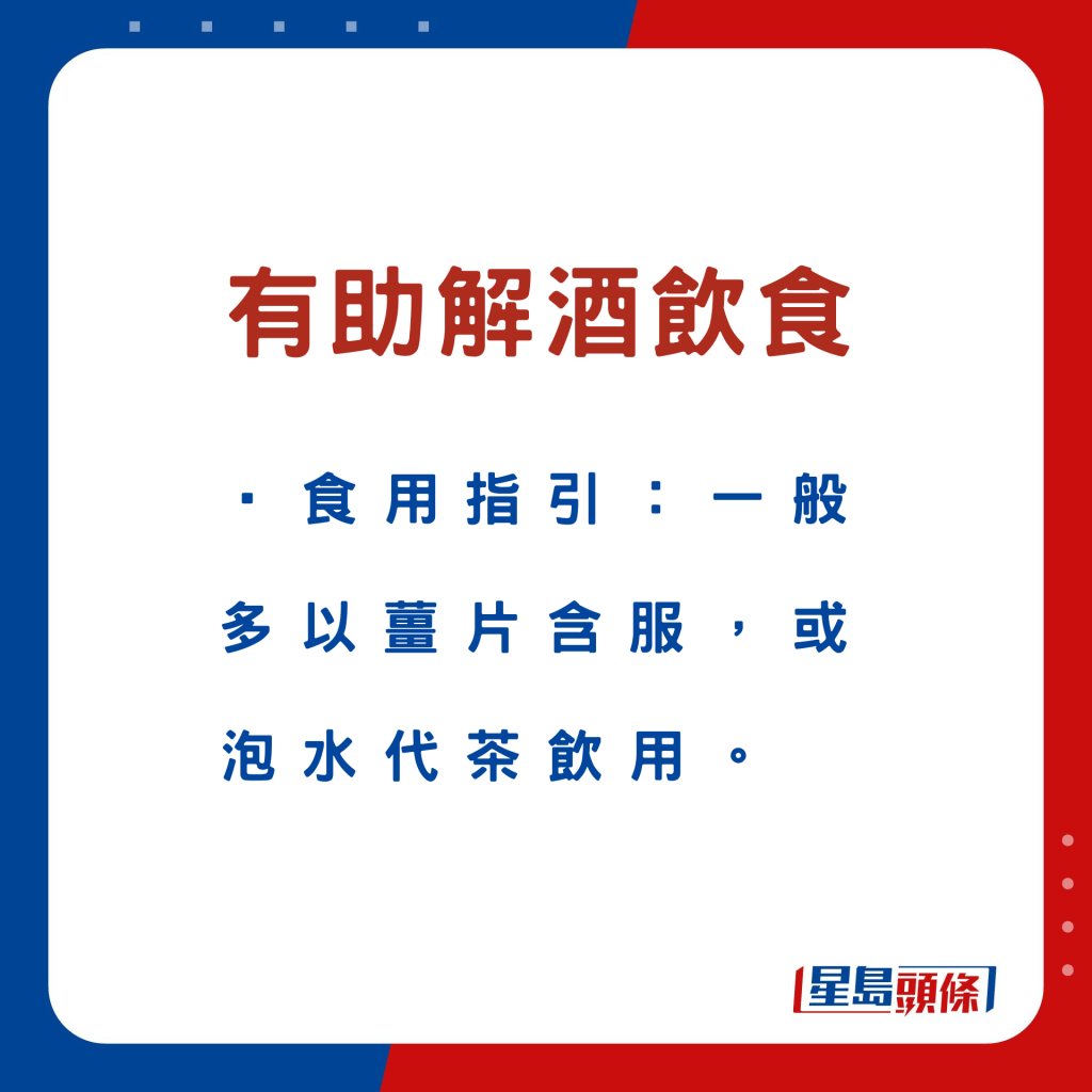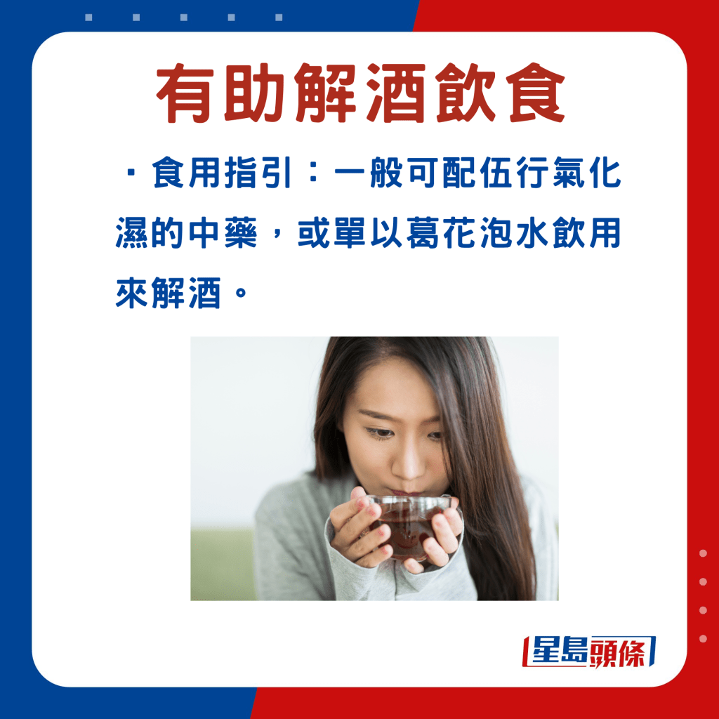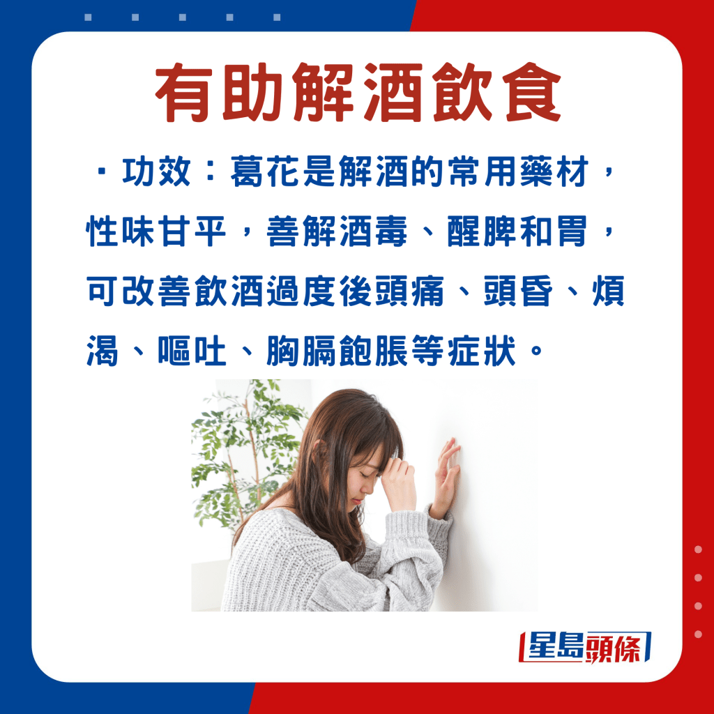 日常飲食中,部分食物有助緩解醉酒不適。中藥材亦含很多抗氧化成分,能保護肝臟,減少因為肝臟代謝酒精時所造成的危害。同時,也可以減輕宿醉造成的不良反應,例如嘔吐、頭暈等。