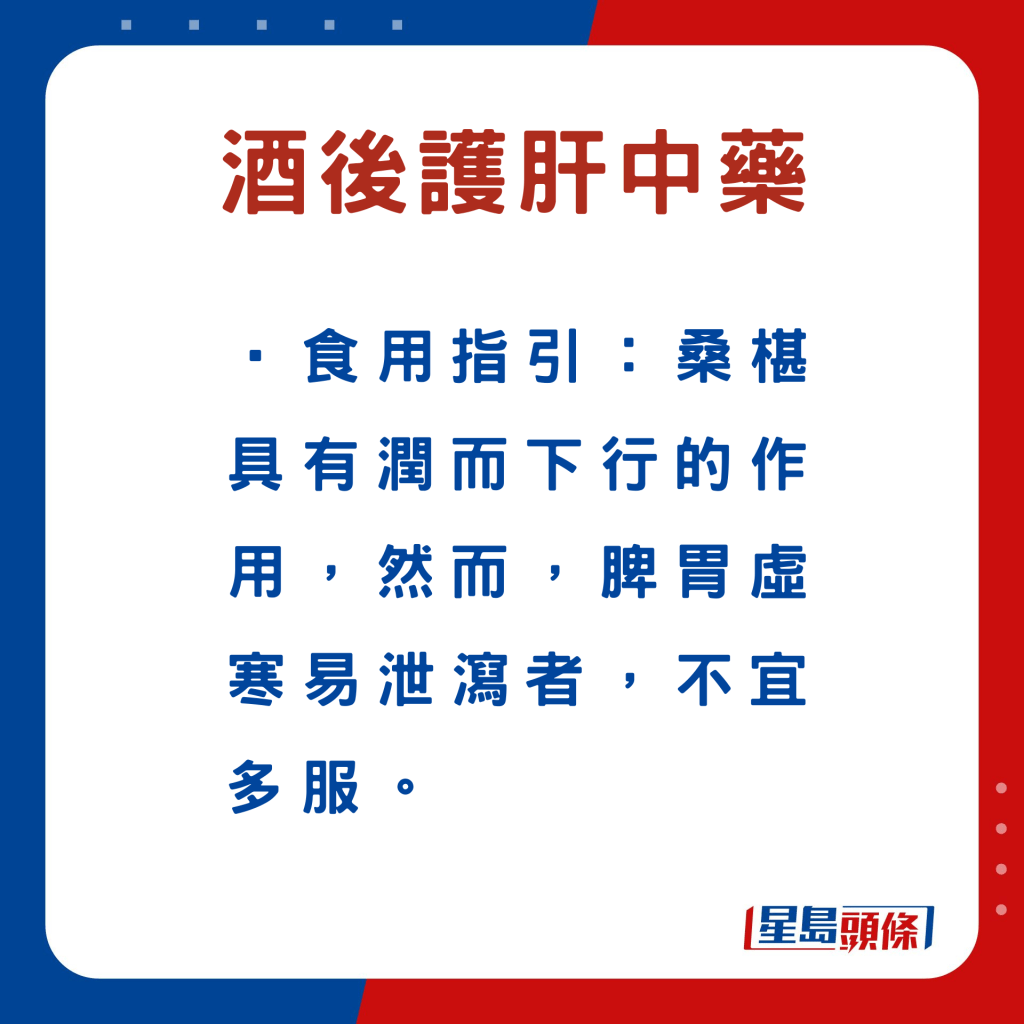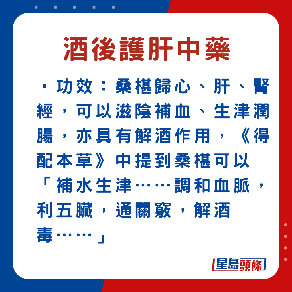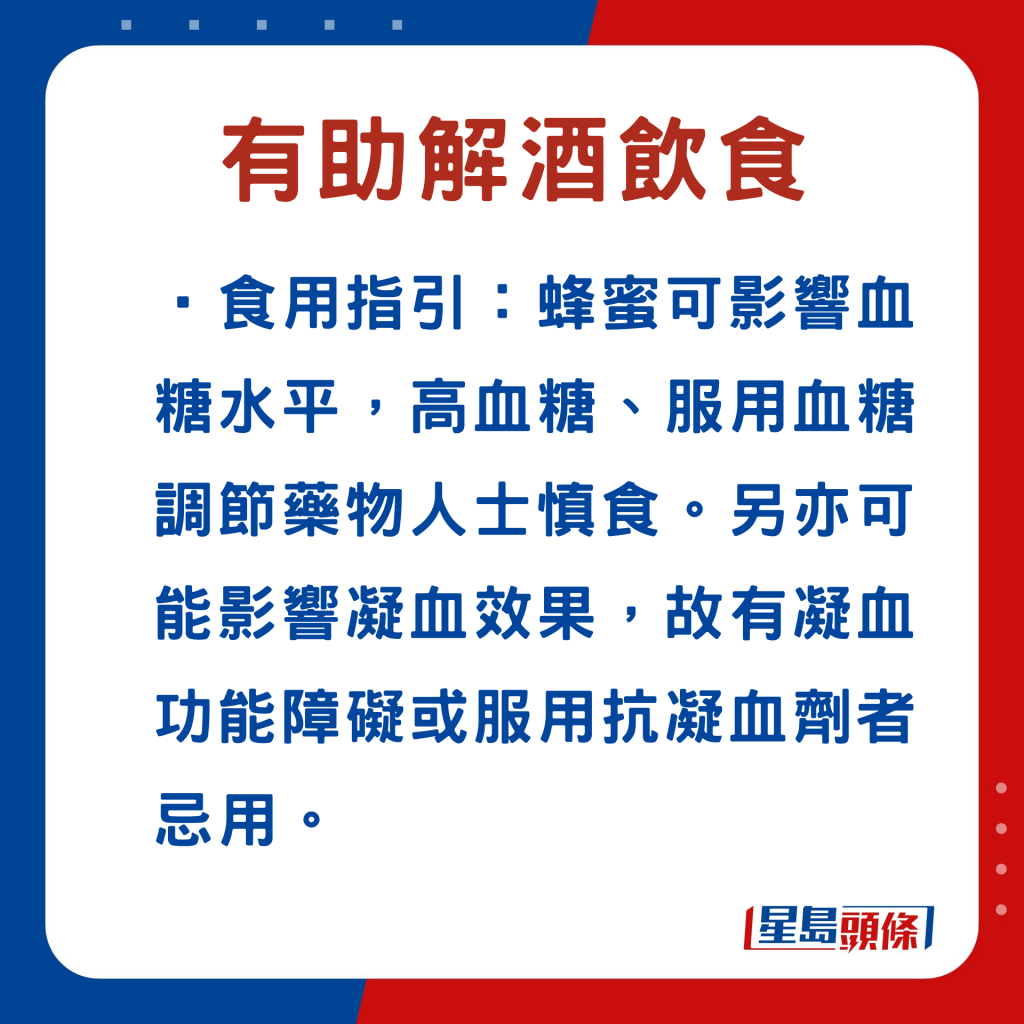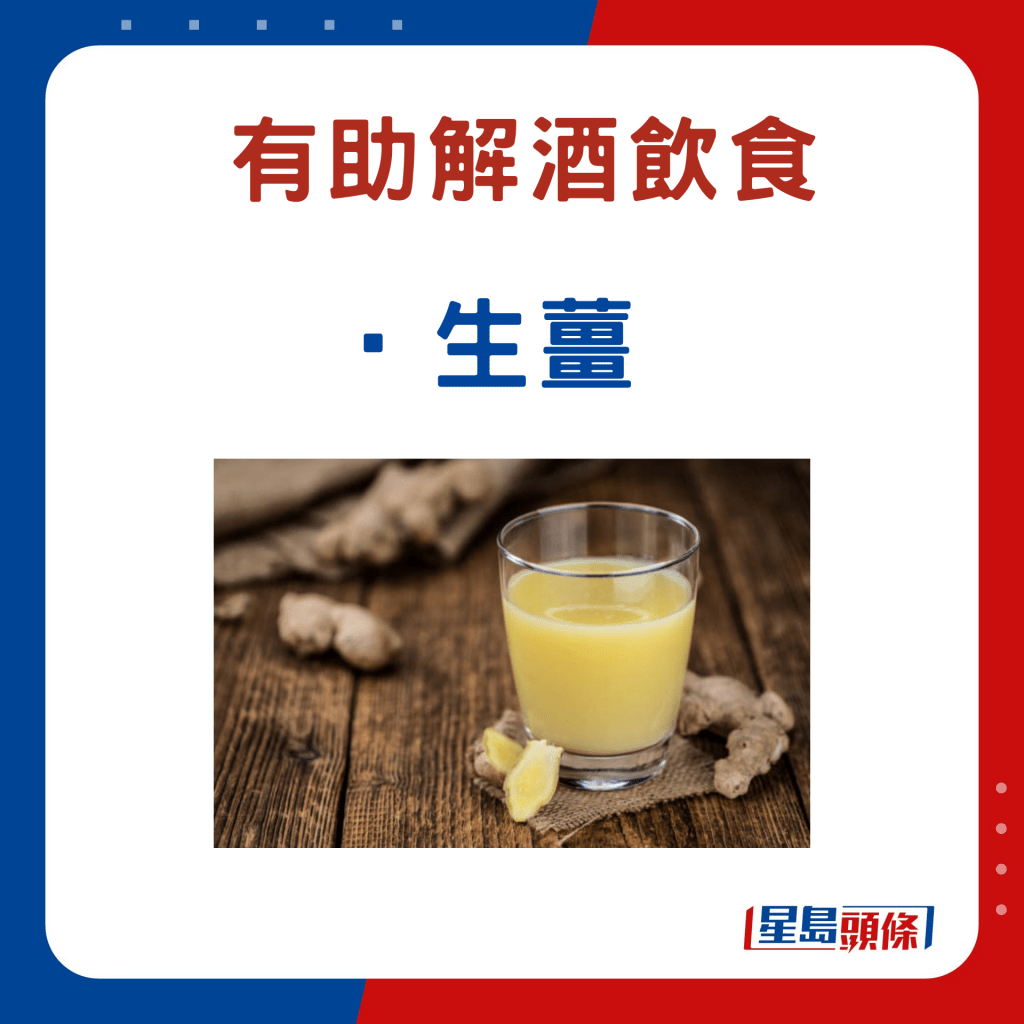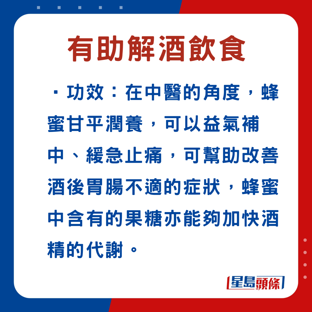 日常飲食中,部分食物有助緩解醉酒不適。中藥材亦含很多抗氧化成分,能保護肝臟,減少因為肝臟代謝酒精時所造成的危害。同時,也可以減輕宿醉造成的不良反應,例如嘔吐、頭暈等。