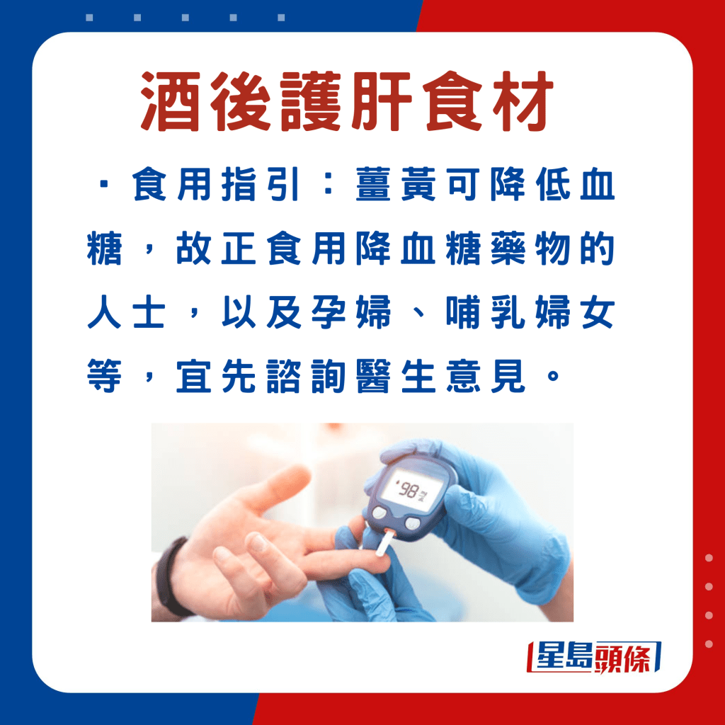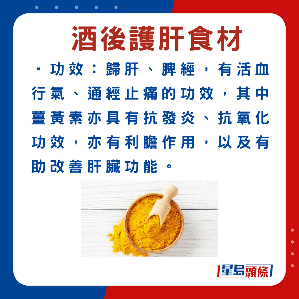 除了中藥材,張勇醫師還挑選5種日常食材,例如姜黃,有助紓緩酒后不適、護肝臟,建議適量食用。詳細食用指引如下: