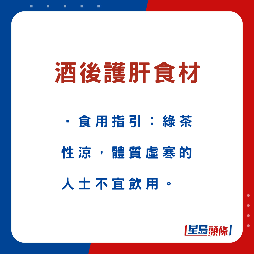 飲酒過后,尤其是宿醉不適、飲酒量較大人士,建議事后借助食療,盡快清除酒類的濕熱,并鞏固肝臟,強化其泄瀉肝火的機能,以收健肝、護肝之效。