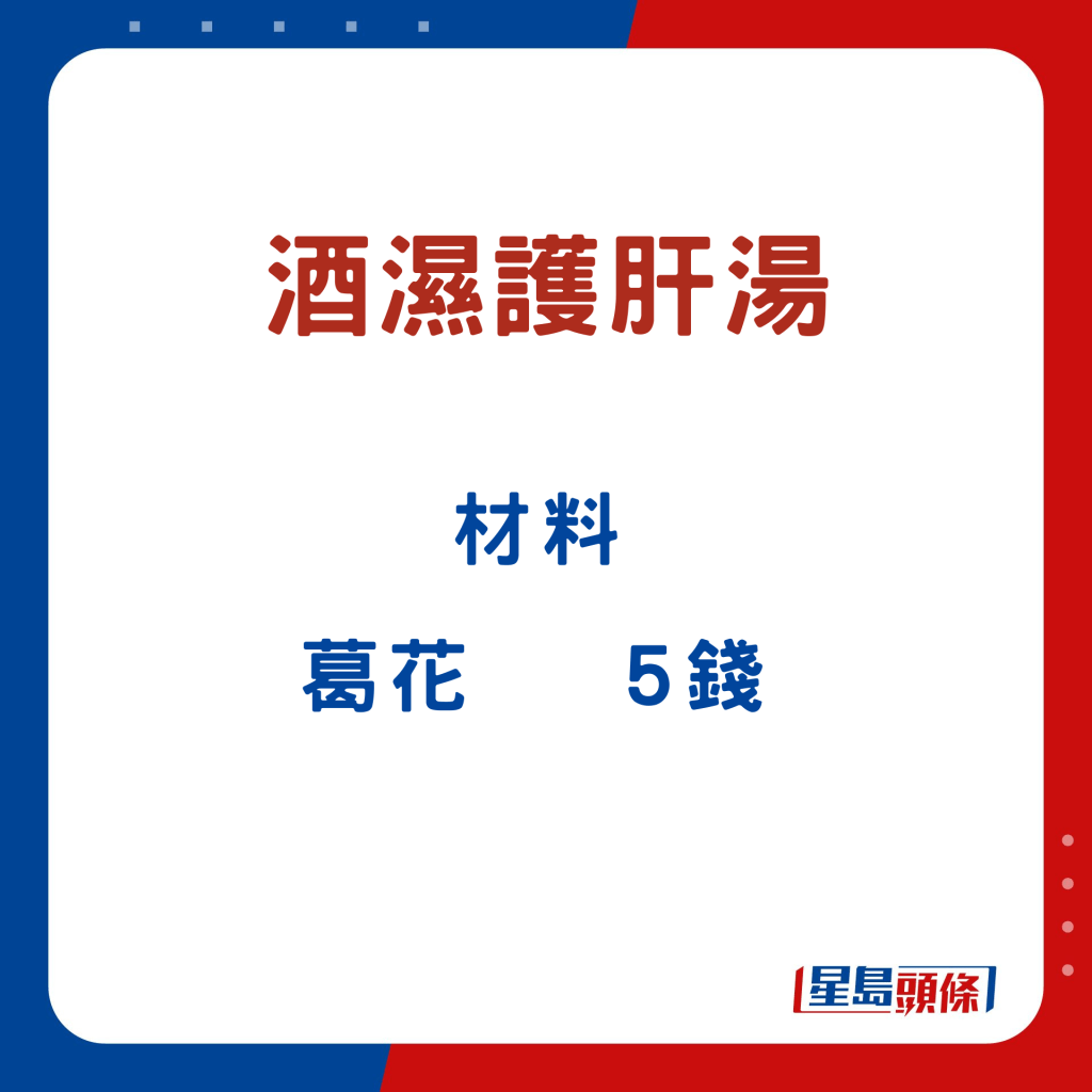 張勇醫師指,常用的解酒中藥材有葛根、葛花?!案鸶焙写蠖管盏瘸煞?,有助延緩酒精的吸收,減低酒精對肝臟的損害。至于“葛花”,則能解酒、醒脾?,F代研究亦發現,葛花含有“異黃酮”,是解酒的主要成分之一。葛花除了解酒效果良好,對于酒精性肝損傷亦起著保護作用。