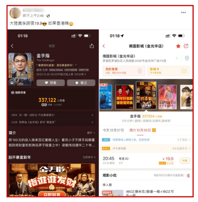 最近有網友在Facebook討論區分享,在深圳看戲的票價非?!翱鋸垺?。以正上映的港產片《金手指》為例,粵語原聲版本最平只要¥19.9。(新年檔期其他電影票價詳見上文圖輯)該帖文吸引不少討論,有網民認為香港電影票價昂貴:“香港戲飛真心加價加到癡左(癡咗), 有時正價看場戲超100蚊。(香港電影票真心加價加到癡左(癡了),有時正價看場電影超100元)”不過要專程北上舟車勞頓看一出電影,網民表示寧愿提早起床:“香港看早場唔貴,仲慳返時間同車費。(香港看早場不貴,還省回時間和車費)”除此之外,有網民點出一原因,不會在深圳看戲。