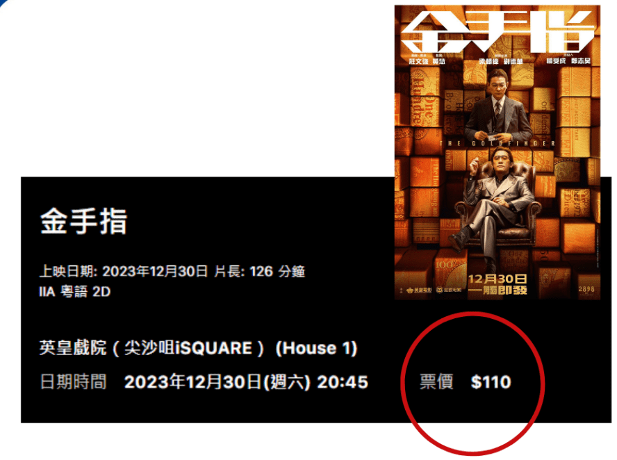 反之在香港尖沙咀一戲院,相同日子、時間的場次則索價110港元