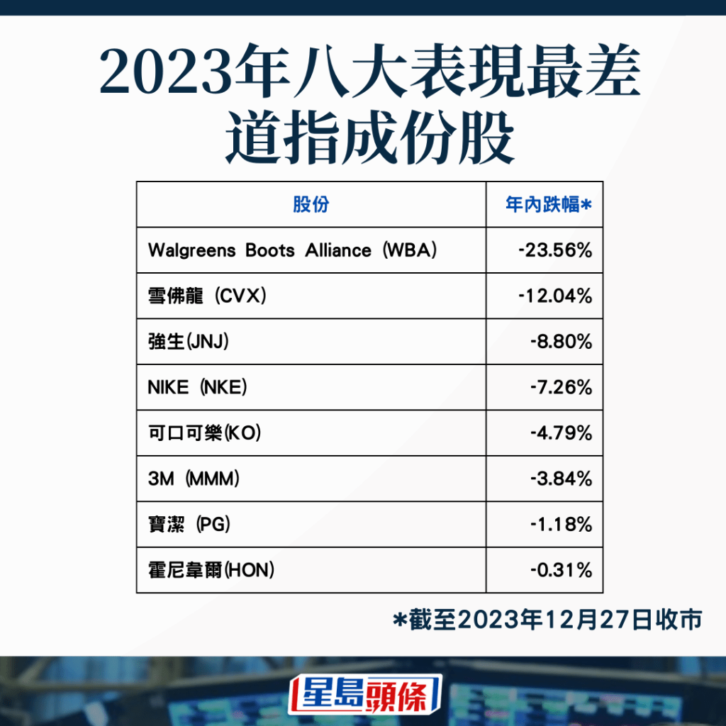 道指在今年底發威,帶動全年累升近14%,成份股中只有8只股份“見紅”。 不過,3只2022年的狗股中,今年繼續跑輸大市,其中3M(MMM)及NIKE(NKE)年內分別跌4%及7%; 藥店連鎖品牌Walgreens Boots Alliance (WBA)去年跌25%后,今年更再跌24%。 今年新晉的道指狗股則分別是雪佛龍(CVX)、強生(JNJ)、可口可樂(KO)、寶潔(PG)及霍尼韋爾(HON)。