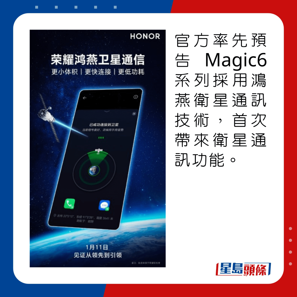 ▲官方率先預告Magic6系列採用鴻燕衛星通訊技術,首次帶來衛星通訊功能。
