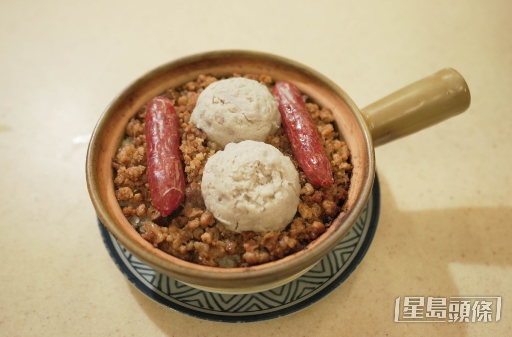 以自家制豬油煲仔飯作主調,配料如牛肉、臘肉、臘腸、滑雞、咸蛋等可自由配搭。