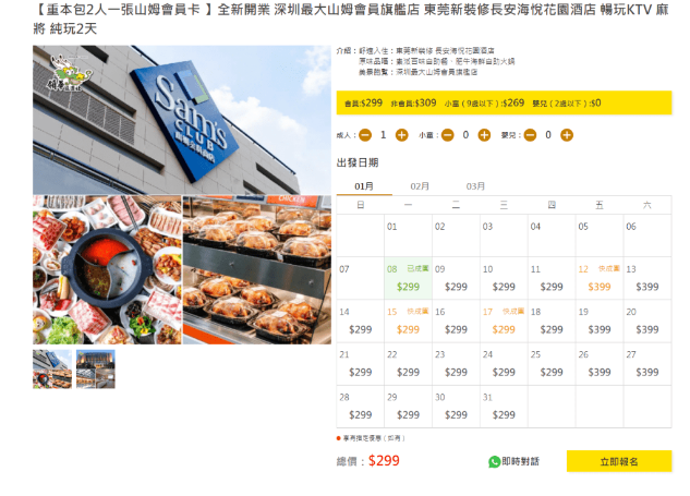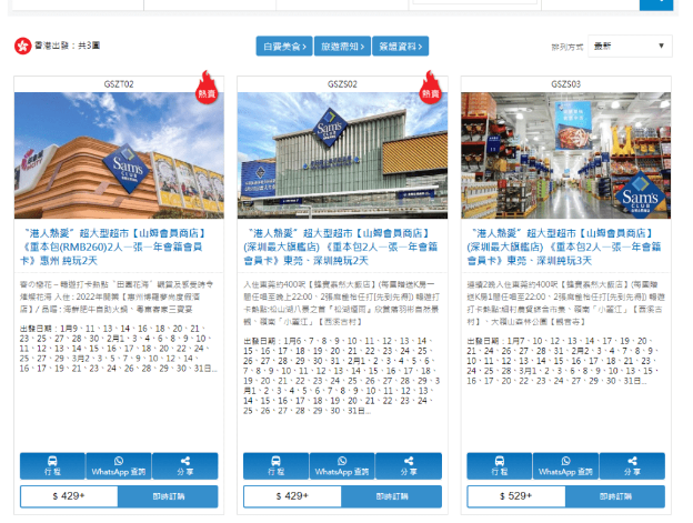 倉庫式超市山姆(Sam's Club)近月大受港人歡迎,多家本地旅行推出山姆超巿掃貨純玩團 ,若二人同行其中一人獲贈會籍,團費介乎99元至699元不等,以東瀛游為例,今月加開來往深圳、惠州、東莞的山姆純玩2天團及3天團,行程還包括西溪古村、田園花海等景點,其間亦獲安排入住酒店及自助餐,吸引不少港人報團,其中東莞深圳純玩2天團日日出發, 但官網顯示今月9日起至31日已全告爆滿,情況非??鋸?。