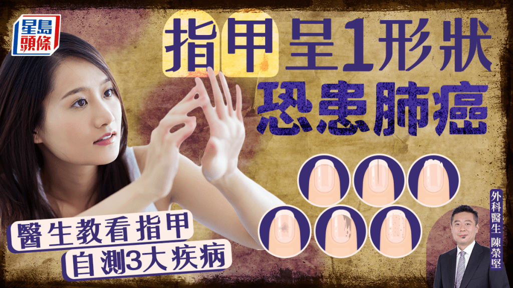 指甲也可以反映身體健康狀況。有醫生指,指甲出現1種形狀,可能是肺癌征兆; 另若出現1種特征,則有機會是皮膚癌警號。他教看指甲的變化自測3大疾病,了解自身狀況,以盡早求醫檢查。