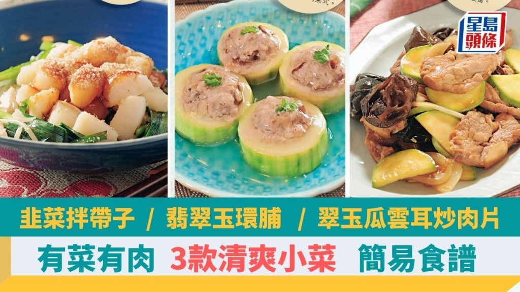 新年家常菜簡易食譜|有菜有肉的家常菜,既富營養,口感又豐富。今日教大家烹調3道鮮味家常菜,包括翡翡翠玉環脯、翠玉瓜云耳炒肉片、韭菜拌帶子,分別以爽口的節瓜、翠玉瓜及韭菜,配豬肉及帶子烹調,材料及做法均簡單,輕易煮出鮮香家常菜。