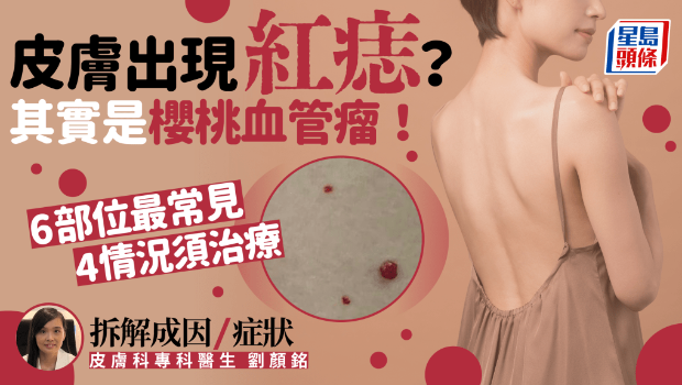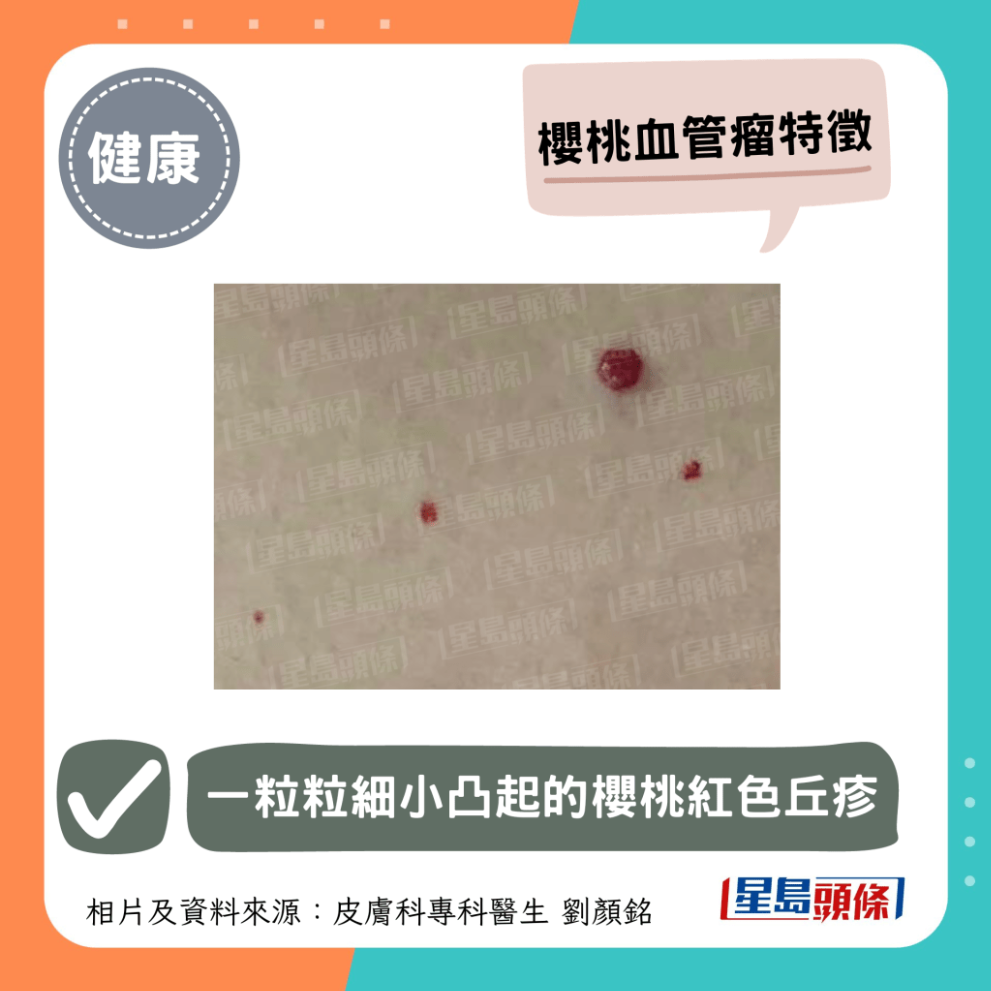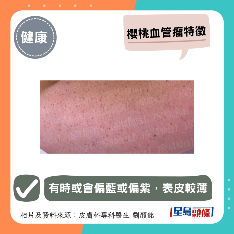 劉醫生指出,櫻桃血管瘤可以出現在身體任何地方,尤其是面頸、手臂、大腿、胸腹、背部等,但較少長在手掌、腳掌、黏膜組織上,患處呈現為一粒粒細小凸起的櫻桃紅色丘疹,有時或會偏藍或偏紫,表皮較薄,直徑大約1mm至10mm不等,一般不痛不癢,但若不小心抓損時,流血量會比平常多。