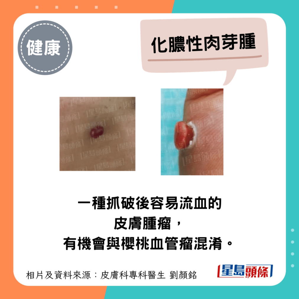 劉醫生指出,還有一種抓破后容易流血的皮膚腫瘤值得留意,這就是“化膿性肉芽腫”(Pyogenic granuloma),有機會與櫻桃血管瘤混淆。 此病是另外一種良性的血管腫瘤,主要出現在皮膚傷口位置。 當傷口發炎及出現血管性病變,就會形成暗紅色凸起的腫瘤。由于腫瘤里面布滿微血管,一旦碰損就很容易流血,可引發痛楚及細菌感染。