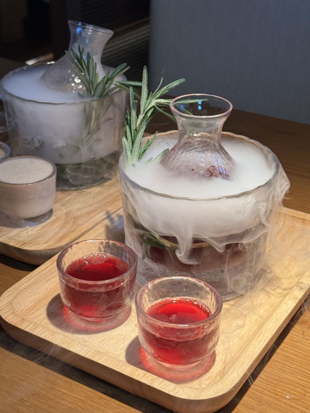 剛踏入店內,已經被東瀛風格的庭園及卡位雅座吸引。 精選特飲自制鮮山楂烏梅汁(32元人民幣)冰涼清爽,甜酸皆備; 至于自然農法榛果造米漿(32元人民幣),先將糙米炒香、榛果烤蒸,再打成稠厚如奶昔狀的米漿,米香和榛果香氣濃郁,入口細膩絲滑。 頭盤越南芒果春卷(36元人民幣)以晶瑩剔透的越南紙米皮包芒果條,造型亮麗而風味清新。 接下來的素湯以果木炭火煨煮,羊肚菌舞茸湯夾雜猴頭菇和豆腐,菇菌香氣撲鼻而富深度。 至于榛果芡實牛蒡湯,配合口感軟糯香軟的雞頭米,素湯甜美而質感相對濃稠。 緊接著的松茸湯包(48元人民幣)造型恰如扁身的小籠包,概念又似傳統灌湯餃,餃皮內包裹集松茸、香菇和秀珍菇三重風味的菇菌湯,鮮甜芳香,窩心暖和,樸實滋味。