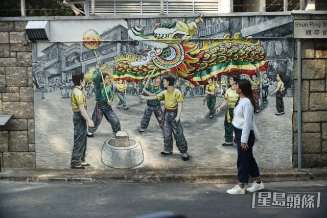 位于舊消防局附近的順平街街名寓意“順利平安”,墻身繪上兩幅壁畫,描繪沙頭角傳統的酬神慶典活動“天后醮典”,沙頭角居民每年都會按傳統舉行天后誕,當中最具特色的就是鶴佬婦女的“陸上龍舟”舞,光看壁畫都可以感受熱鬧氣氛!