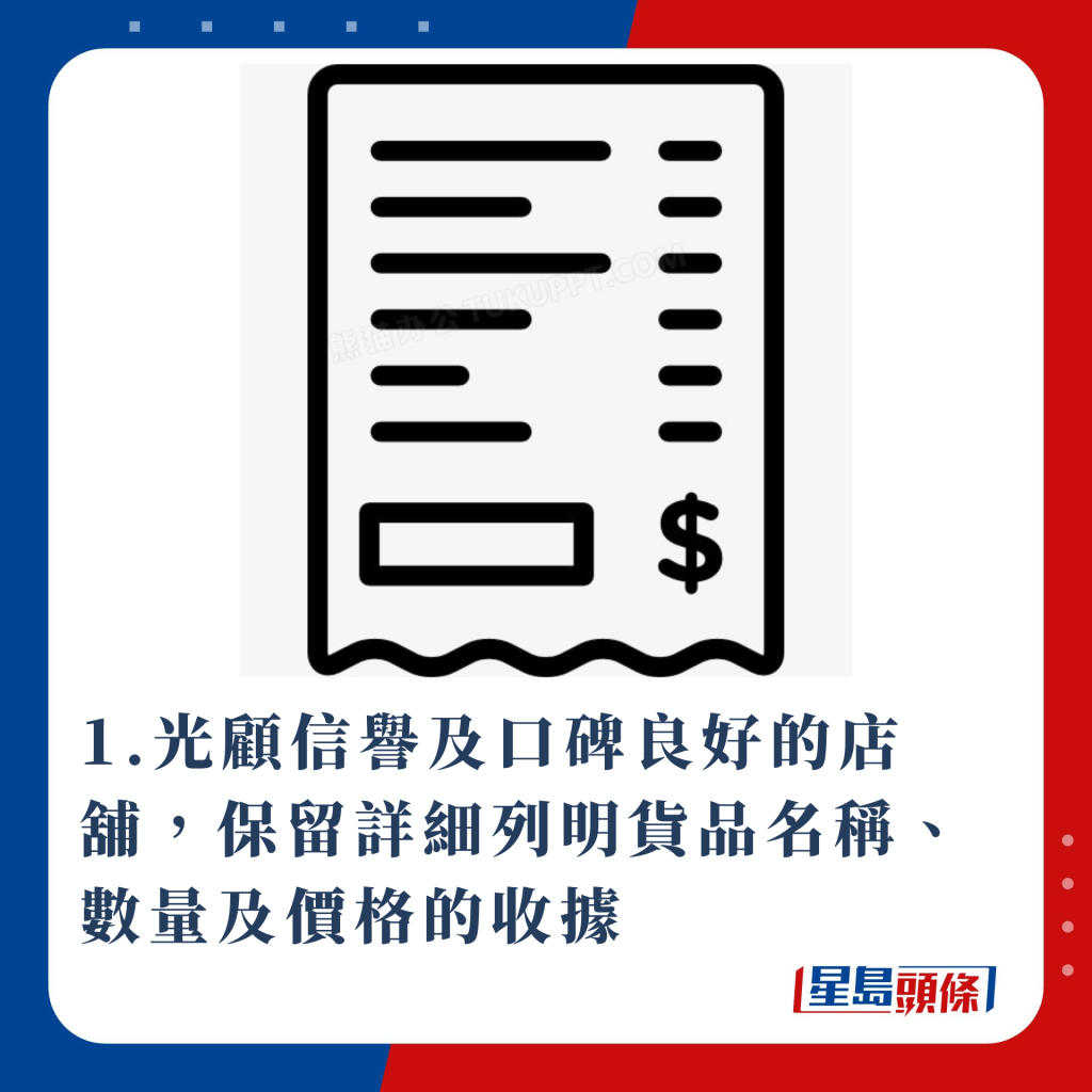 1.光顧信譽及口碑良好的店鋪,保留詳細列明貨品名稱、數量及價格的收據 ? ?