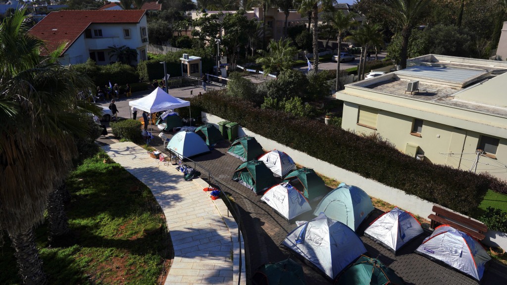 以色列人質家屬及支持者在內塔尼亞胡私宅外扎營。